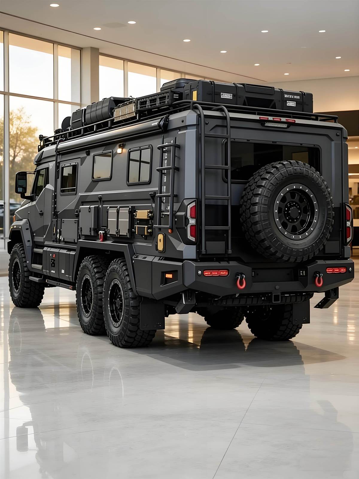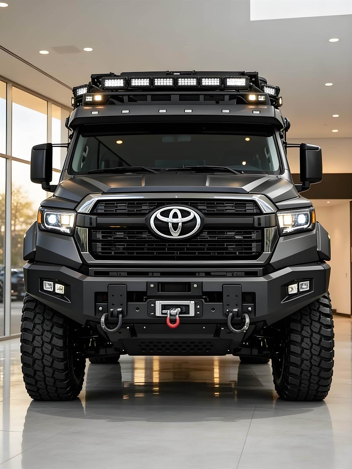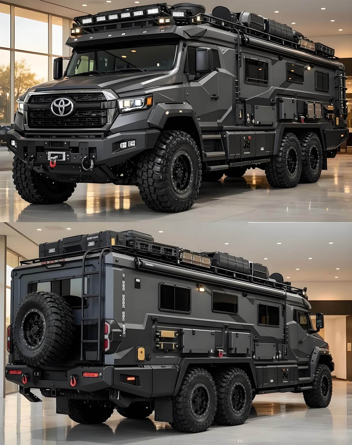 豐田全新六輪末日越野車型正式亮相,以六輪驅動、強化防護與極限越野配置,打造末日級移動堡壘,成為台灣頂級越野玩家與探險愛好者的終極夢幻車款。外觀採全車防彈級復合材質車身,搭配六輪全地形越野輪胎與高剛性底盤,車頂整合 LED 探照燈與裝備置物架,車身側邊裝置艙與後方備胎架,硬派軍事風格拉滿,無論沙漠、沼澤或巖石地形皆能輕鬆征服。