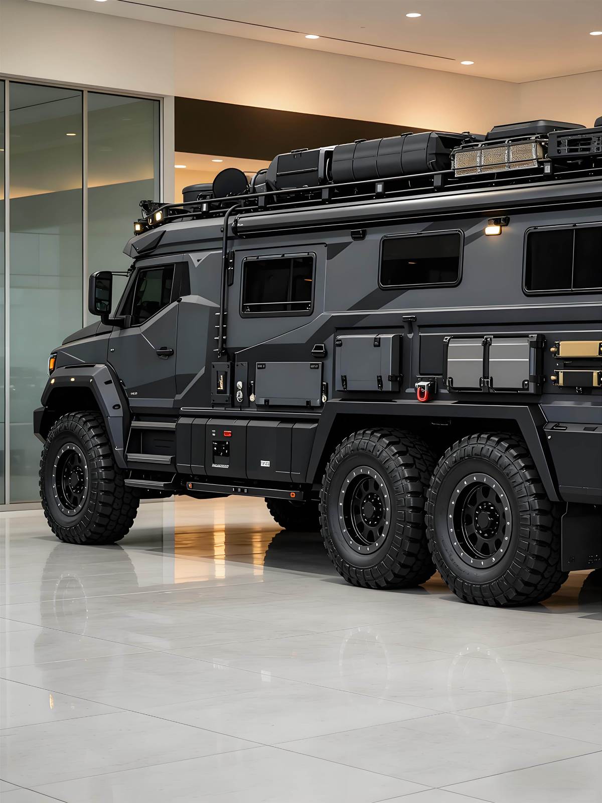 底盤強化抗扭剛性,配備主動式液壓懸吊與輪胎中央充放氣系統,可根據地形即時調整輪胎氣壓與車身高度,制動系統升級 Brembo 碳陶瓷煞車,確保極限狀態下的制動穩定性。內裝採軍規級防護設計,駕駛座配備 12.3 吋數位儀表與 14 吋中控螢幕,支援衛星導航與緊急通訊系統,座椅採防彈材質與加熱通風功能,車內設獨立空調與淨水系統,兼顧極限環境下的舒適性與生存性。