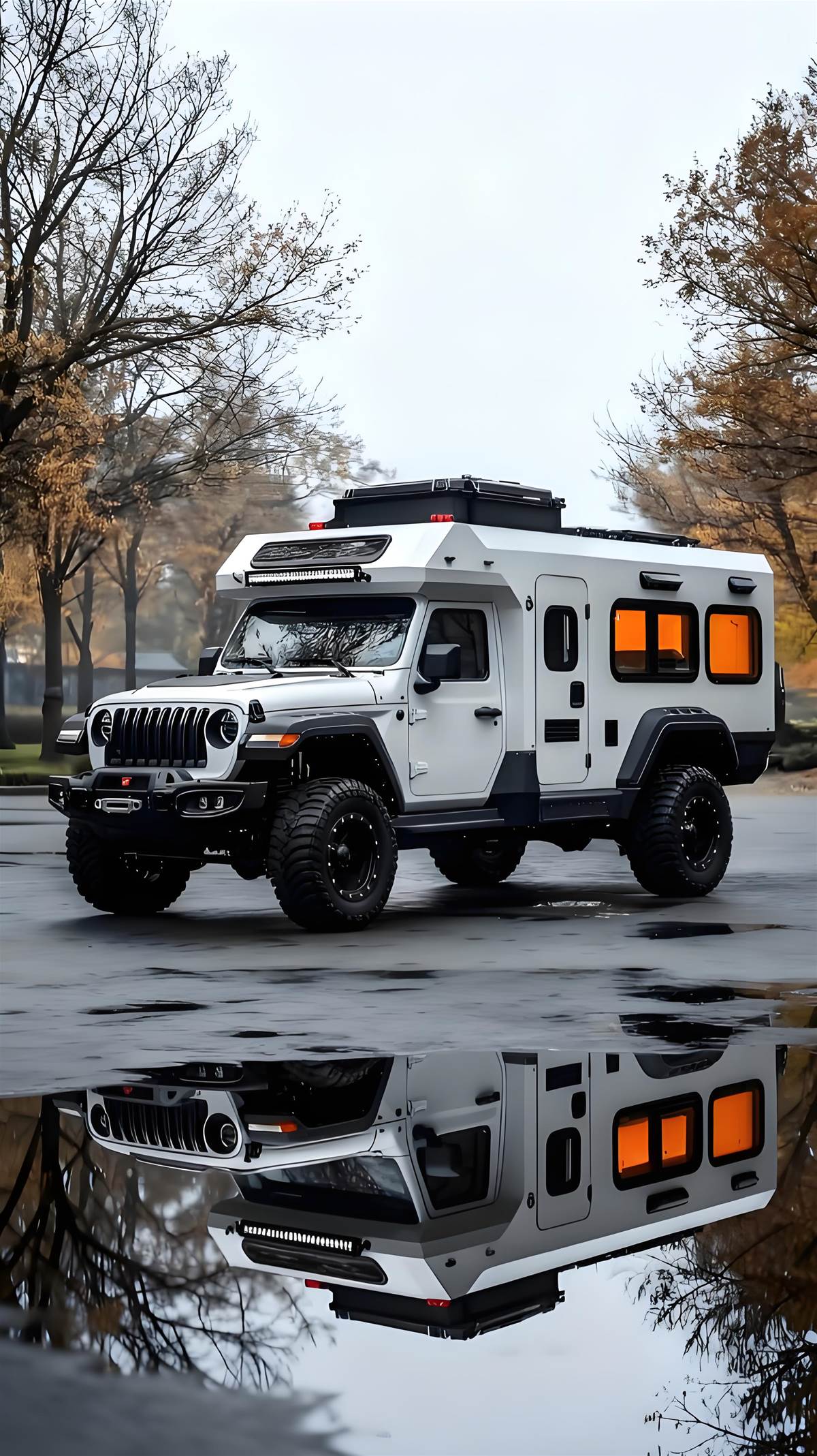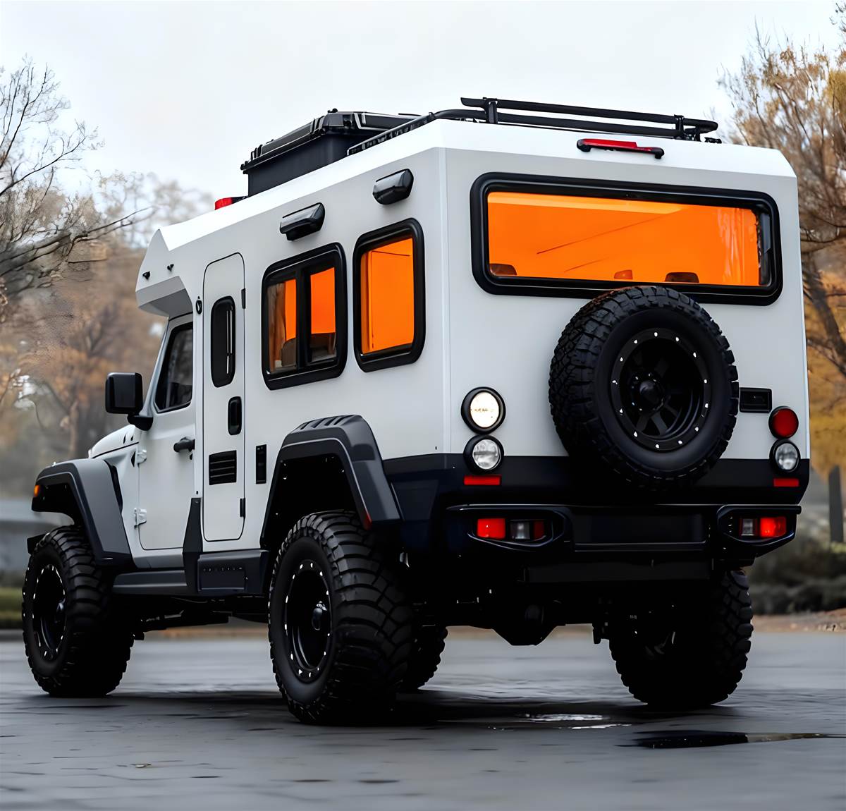 這款車以藍哥四門版為基礎改造,保留了4X4越野底盤與高離地間隙,車身加長後裝上獨立露營艙:側窗用了遮光橘色玻璃,車頂配有太陽能板與儲物箱,車尾還加上備胎與對開式尾門,既能走林道也能直接在車旁搭賬。
