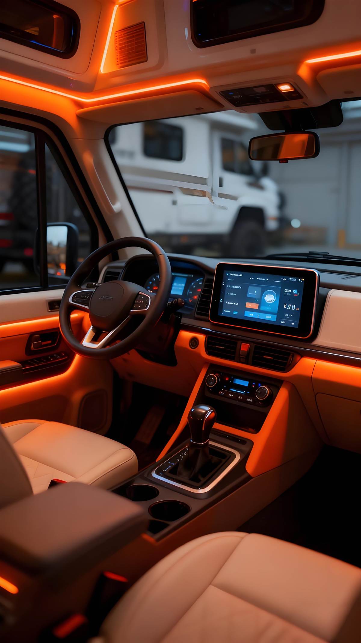 車內中控維持藍哥的粗獷設計,但加了露營專用的觸控螢幕,能監控水箱、電力;後方艙室則有摺疊床、迷你流理臺,基本滿足2人過夜需求。