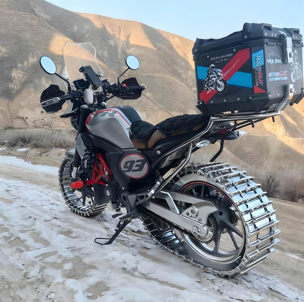 從畫面中可見,這輛本田CB750保留了原車的街車骨架,車身側面的「93」賽道數字貼紙彰顯運動基因,卻在輪胎部位做出徹底改變:前輪換裝輕量化雪地防滑鏈,後輪則直接替換成大尺寸金屬履帶,齒狀結構牢牢抓地,即便是積雪與泥濘混合的非鋪裝路面,也能輕鬆碾壓。