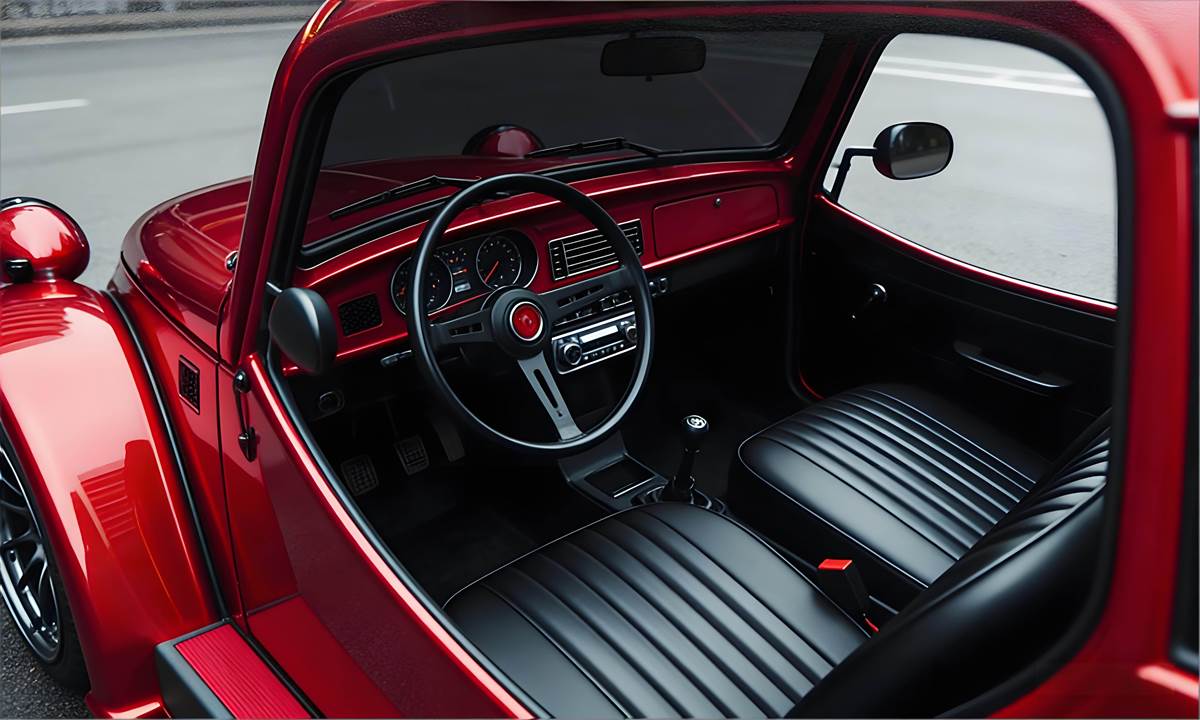 現代感拉滿:亮紅色的車漆質感爆棚,搭配大尺寸的黑色運動輪轂、紅色剎車卡鉗,還有前鏟、側裙這些運動套件,瞬間把老爺車的 「老氣」 一掃而空,滿滿的效能感。