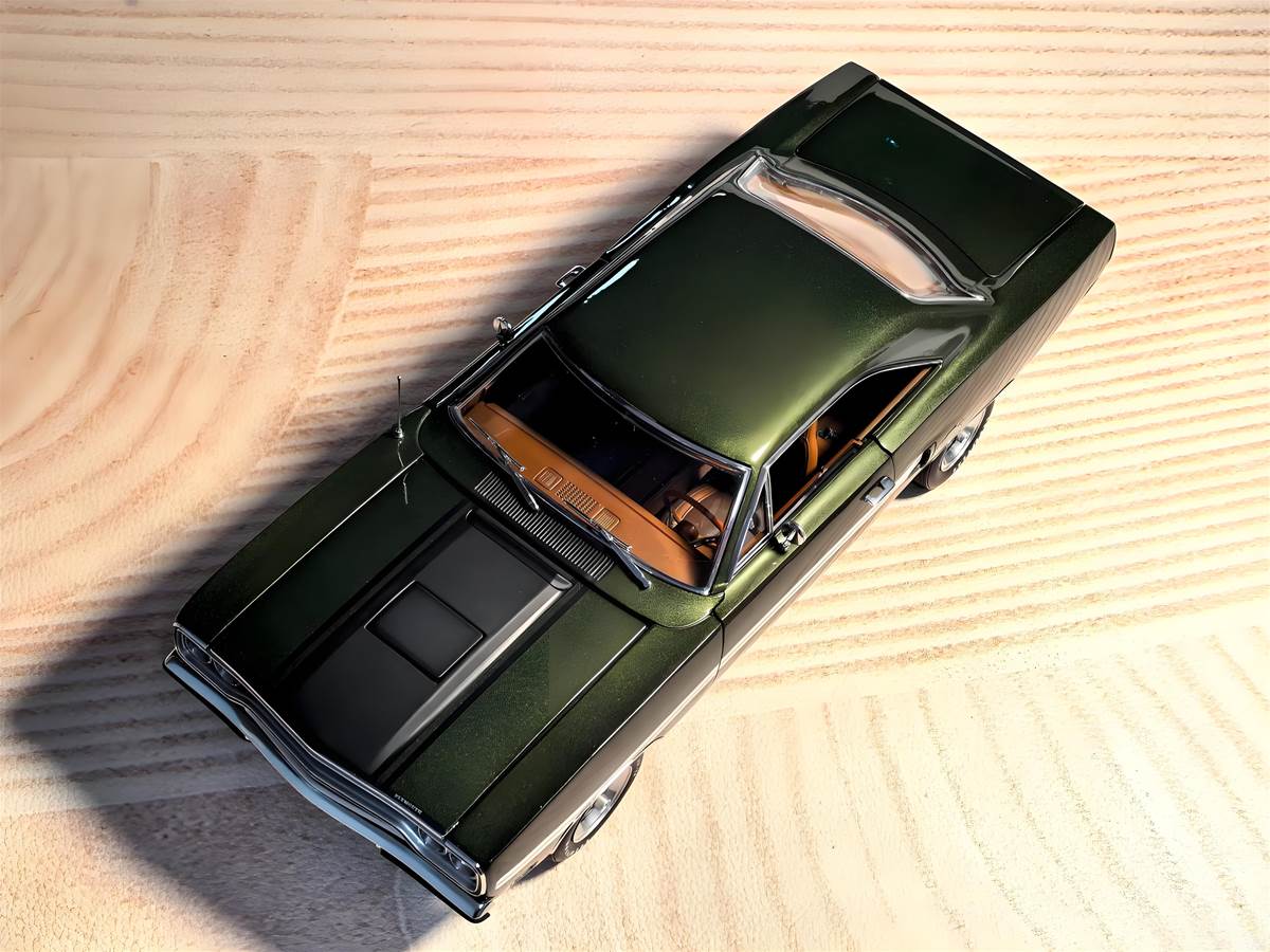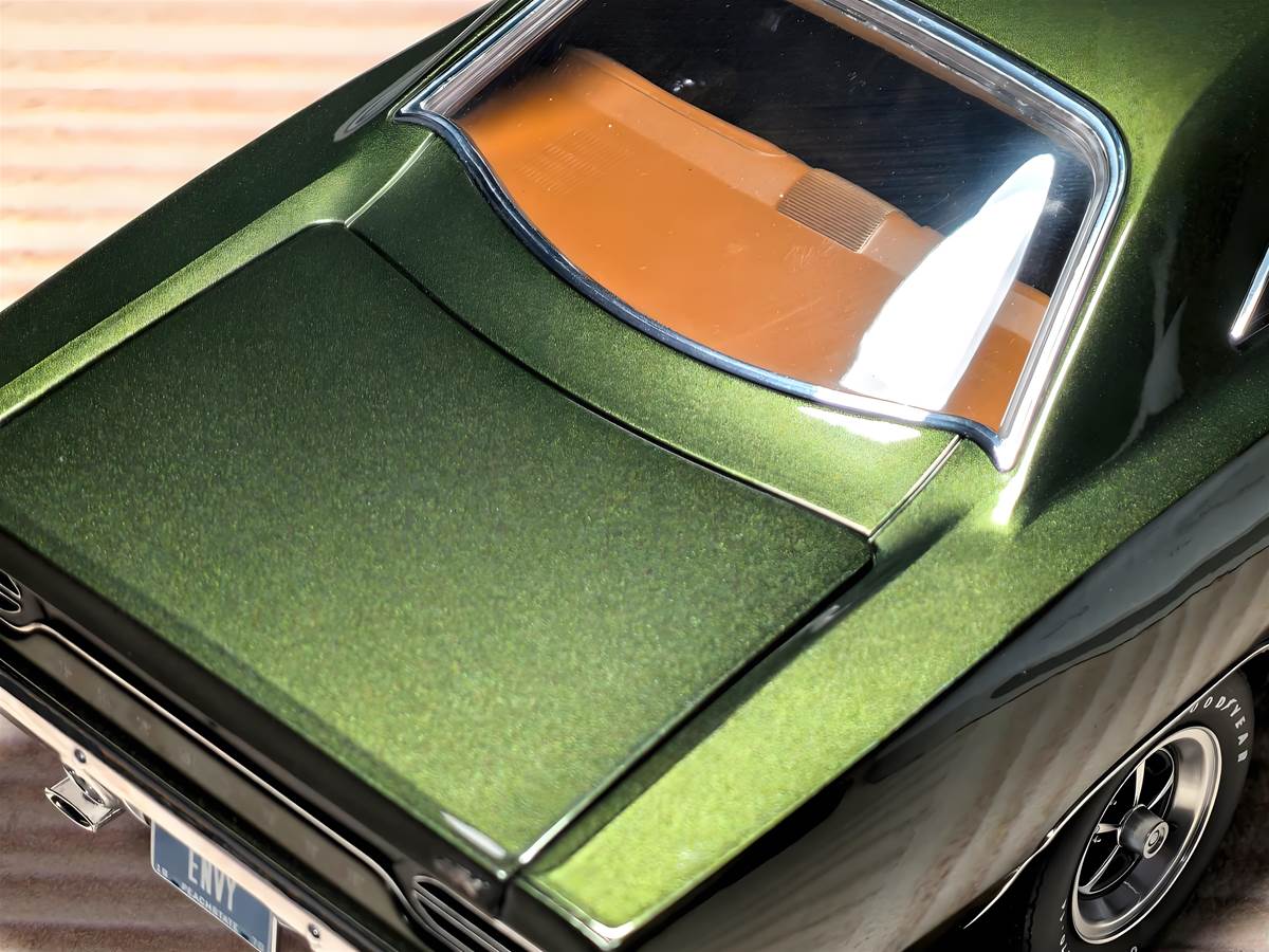 車身披覆的墨綠色金屬漆質感絕佳,陽光下折射出細膩光澤,完美還原經典美式肌肉車的粗獷與優雅。此前因缺少關鍵配件留有遺憾,好在透過模型圈交流,順利覓得匹配配件,讓這臺模型重回完美狀態。