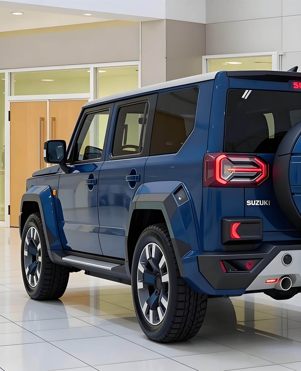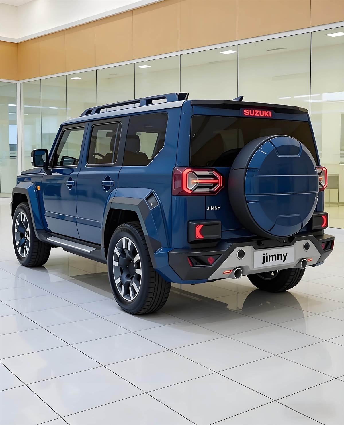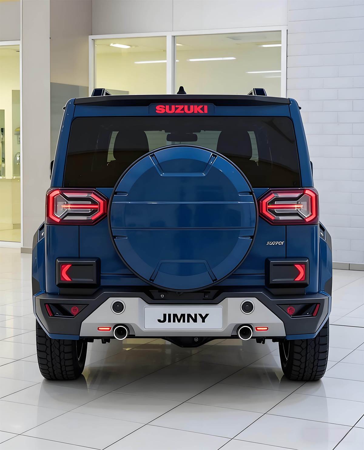 越野細節滿滿:黑色輪拱、前後護槓、全地形胎與車頂行李架,氣場直逼大 G 辨識度拉滿:圓形備胎罩 + 分體式尾燈,一眼就能認出這是「Jimny」