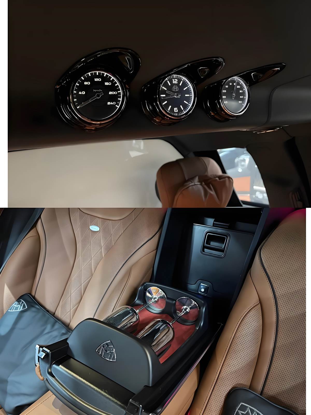 內裝才是金字塔尖的奢享體驗!2+2 對向四座佈局,後排獨立航空座椅採用 128 道工序鞣製的 Nappa 全粒面小牛皮,觸感柔如嬰兒肌膚;18 組氣動按摩、熱石理療與零重力躺臥模式,48 度黃金仰角讓長途出行比躺平更愜意。FSC 認證西伯利亞樺木飾板經 18 道漆面處理,亮如鏡面,搭配施華洛世奇水晶時鐘與玫瑰金飾條,32 小時手工縫製的鑽石絎縫工藝暗藏匠心。