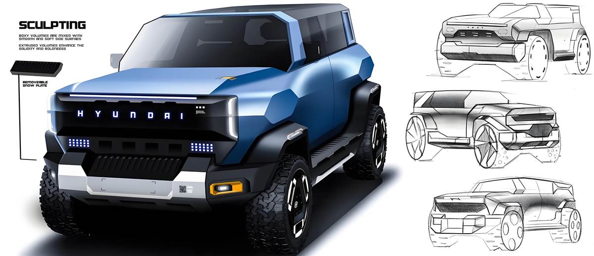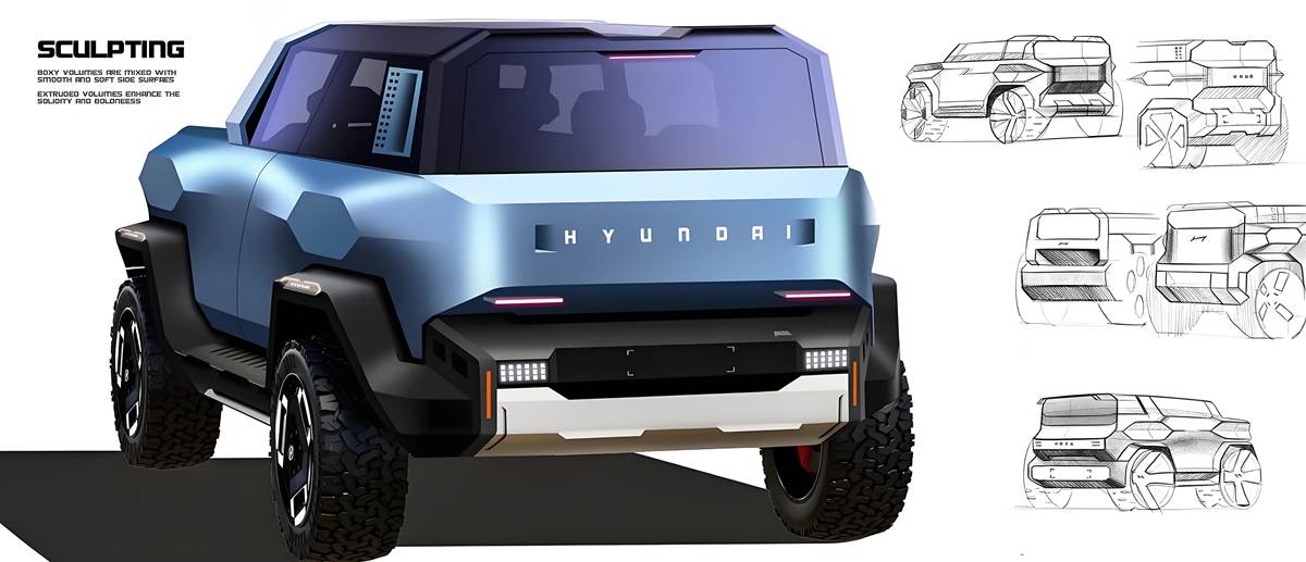 作為硬派越野車的核心競爭力之一,外觀設計直接決定了車輛的氣場,而這款現代全新車型顯然精準拿捏了「霸氣」二字。前臉採用超大尺寸的直瀑式水箱護罩,搭配稜角分明的LED頭燈組,燈組內部的日行燈呈貫穿式設計,點亮後辨識度拉滿,整體視覺衝擊力十足。車身側面線條硬朗流暢,平直的車頂設計不僅保證了車內頭部空間,更強化了硬派屬性,搭配寬大的輪眉與高扁平比的越野輪胎,進一步提升了車輛的透過性與視覺氣場。車尾部分,方正的造型與前臉遙相呼應,貫穿式LED尾燈與粗壯的後保險槓相得益彰,再加上外露的拖車鉤,硬派越野的質感直接拉滿。