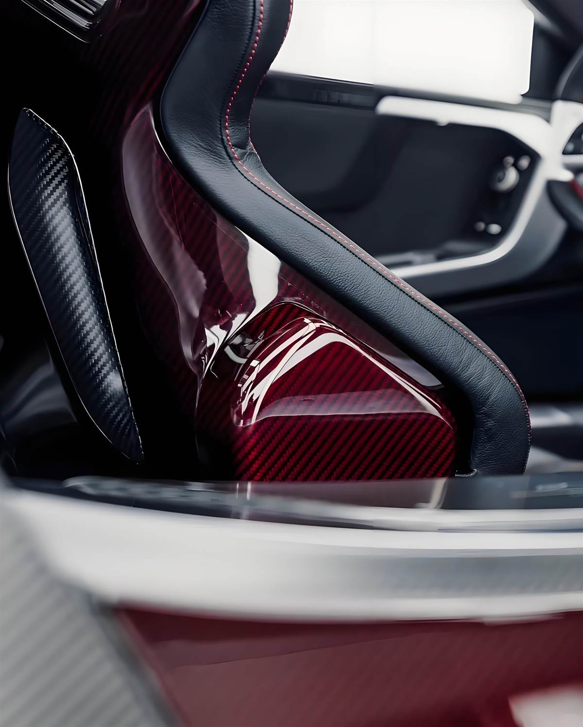 這款特殊編織工藝的紅色碳布,從車頭鼻翼延伸至尾翼,再順著座艙中控臺纏繞至座椅靠背,宛如把速度與力量直接縫入車身,每個角度都散發著強烈的視覺衝擊力,哪怕靜止停放都像隨時要突破時空。