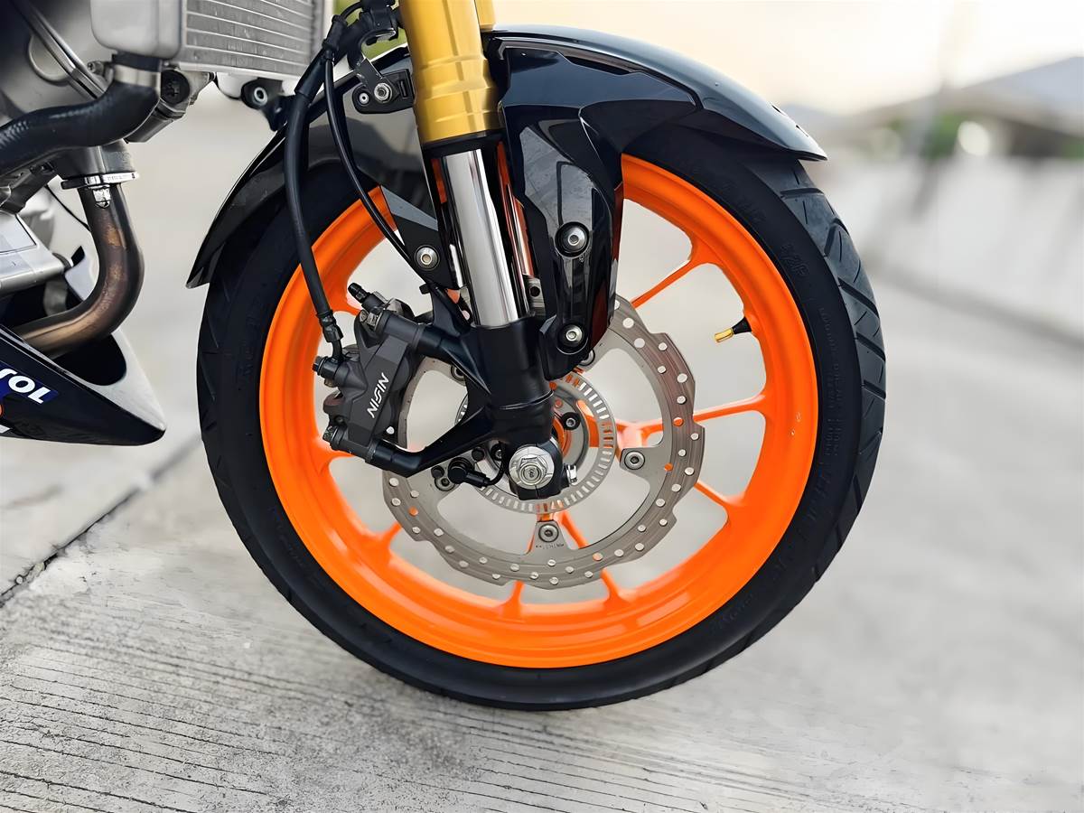 原廠 CBR300R 的分離式把手戰鬥感十足,長途騎乘容易手痠,這臺直接換裝高把位街車把手,騎姿瞬間變得直立放鬆;座椅升級加厚防滑軟墊,支撐性更到位,通勤跑山都不顯累。