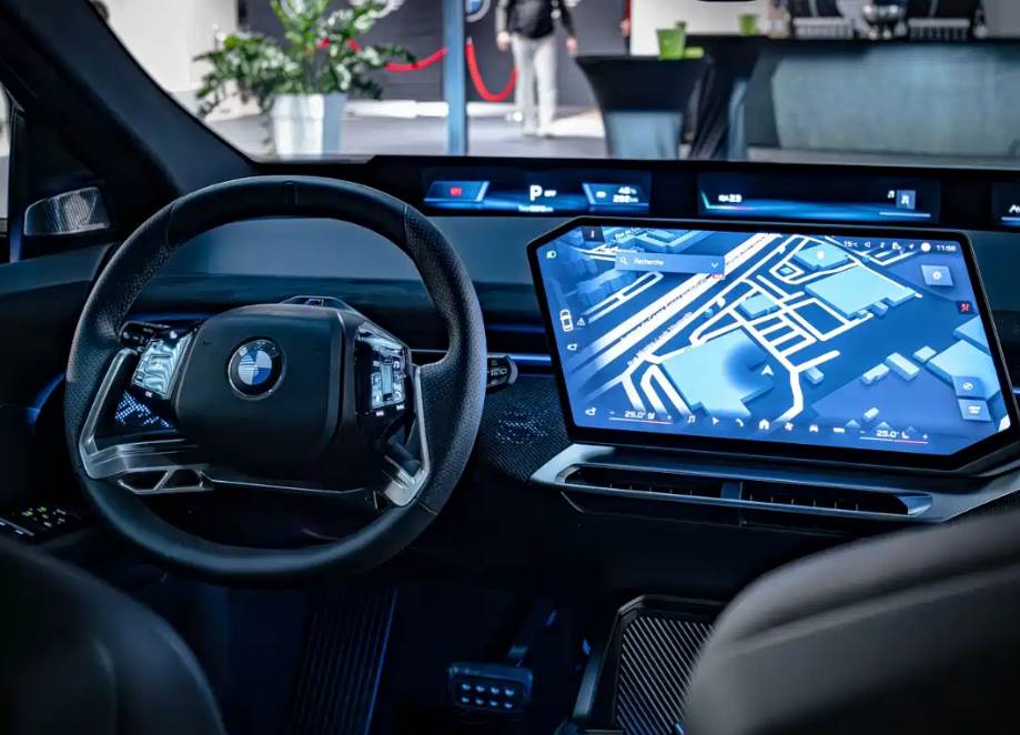 坐進車艙,寶馬 iX3 則展現出與傳統燃油車款截然不同的科技氛圍。全新造型方向盤極具科幻感,搭配前方的視平線全景顯示系統,將行車資訊直接投射至前擋風玻璃,形成約 40 英寸的 4K 解析度顯示畫面,大幅提升行車時的資訊獲取效率。