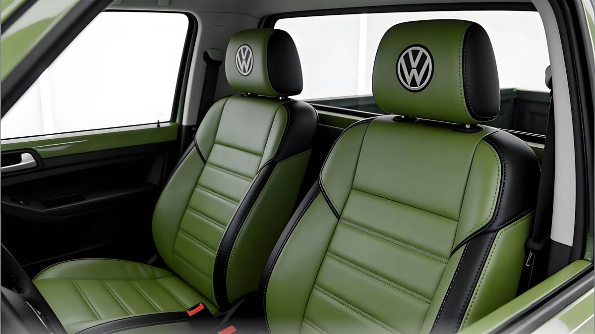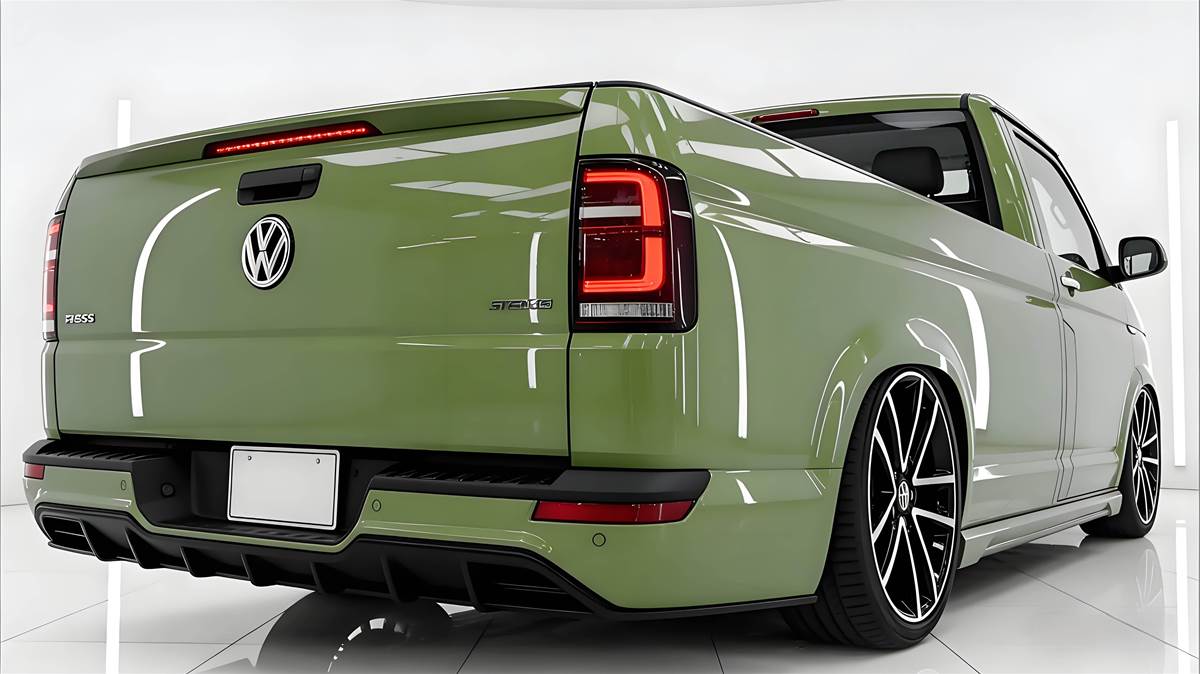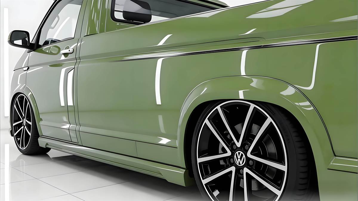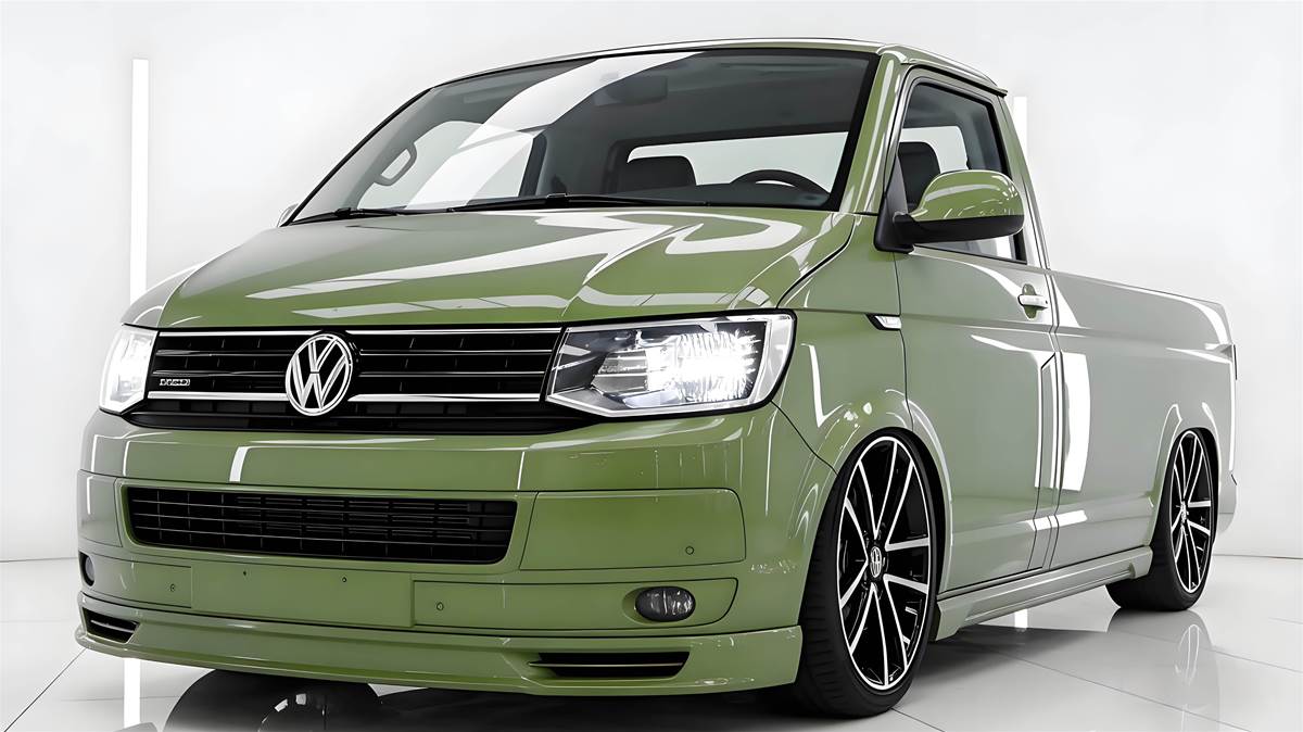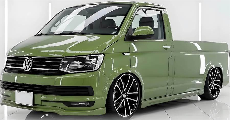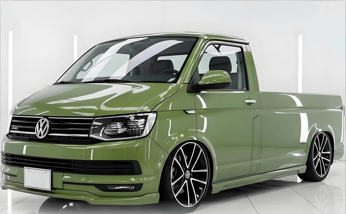 這款以福斯 T7 為基礎改造的單廂皮卡,在外觀上徹底跳脫商用車的樸實框架,獨特的復古綠車身搭配低趴懸吊與雙色鋁圈,視覺張力十足,完美融合商用車的實用與效能車的個性。