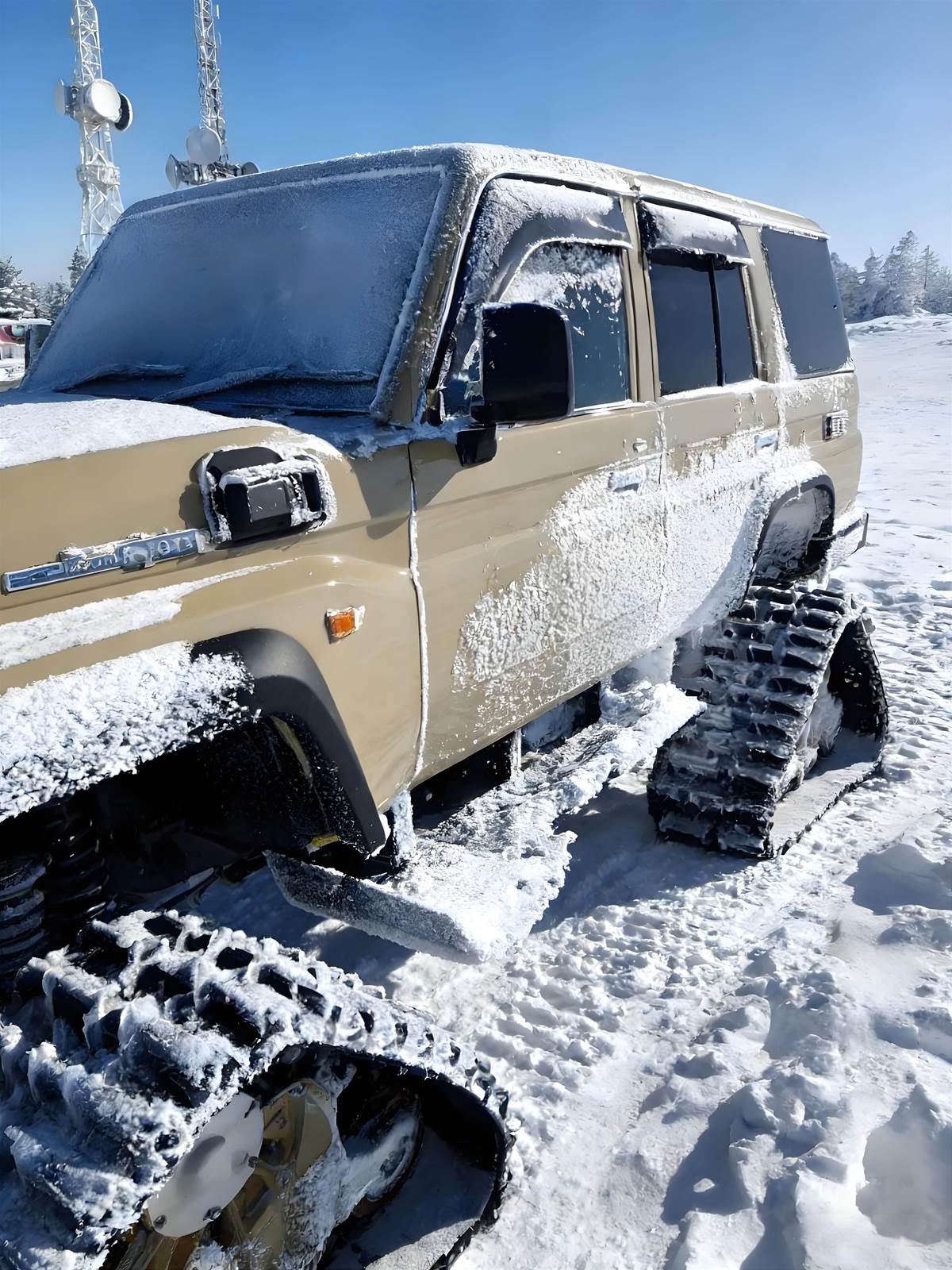 極地專屬套件:車頭加裝防雪護板與 LED 輔助燈,車頂配備行李架與雪地脫困板,車尾的全尺寸備胎保留原廠設計,每一處細節都在宣告:「我為征服極端而來」。開它在雪地撒野,路過的滑雪愛好者直接掏出手機狂拍,這回頭率比蘭博基尼還高!效能:履帶 + 三把鎖,冰原越野如履平地別以為陸巡只是 「公路坦克」,這套履帶版直接把越野能力拉到了天花板:履帶式脫困系統:履帶接觸面積是普通輪胎的 4 倍,壓強降低 60%,就算在鬆軟的積雪或冰面上也不會陷車,-40℃低溫下依然保持出色韌性。