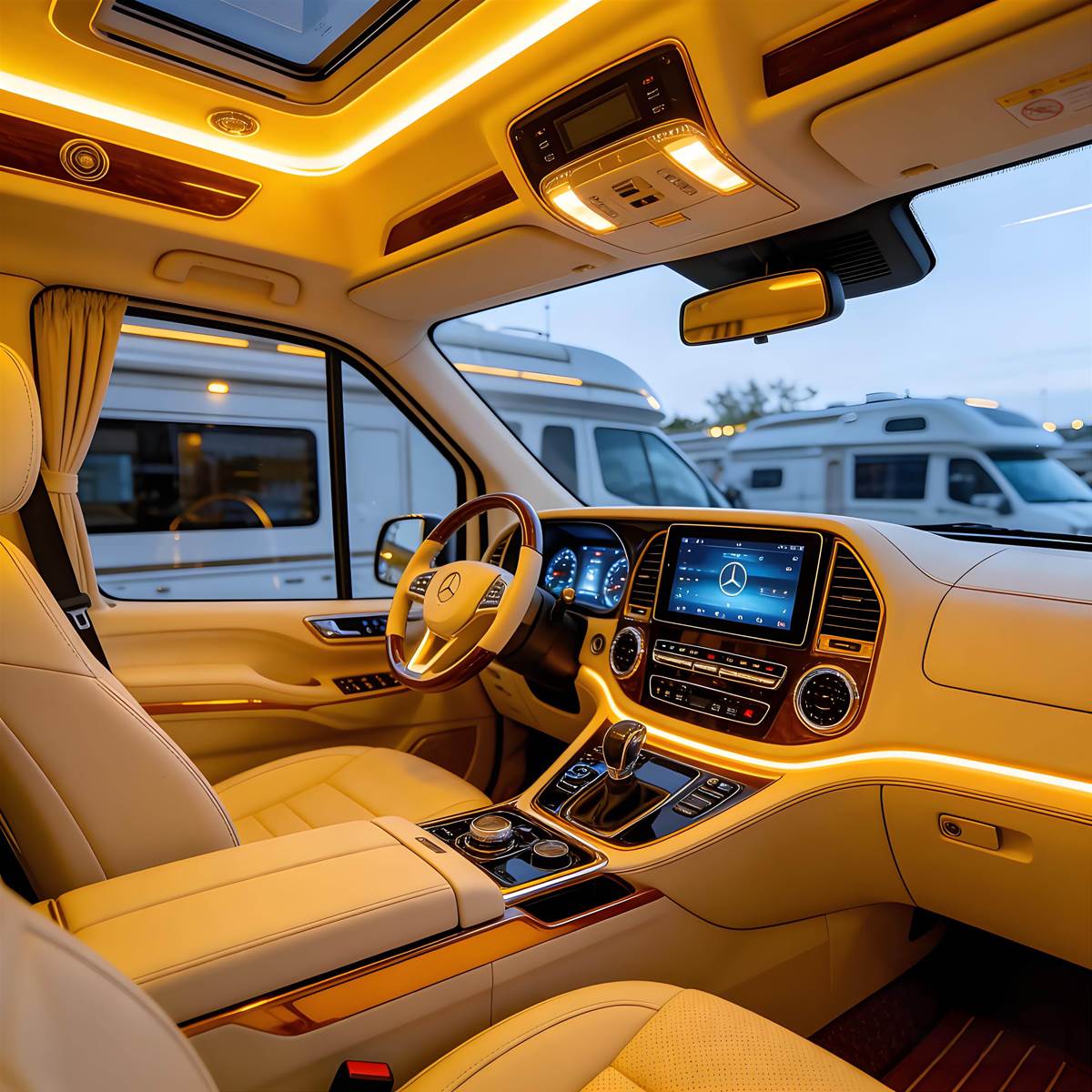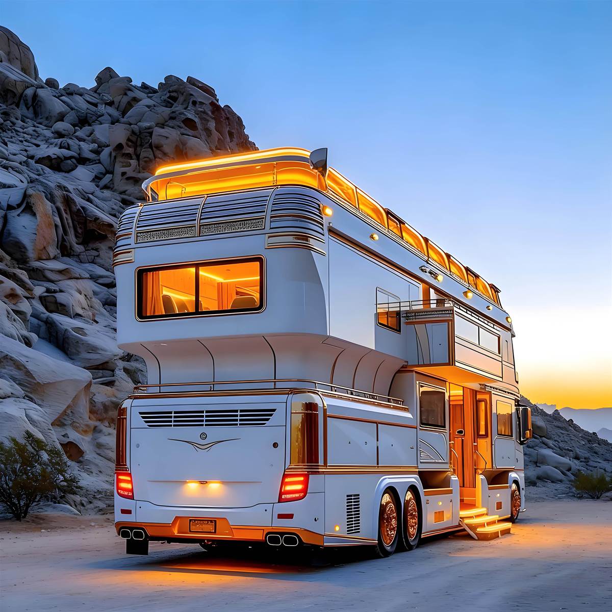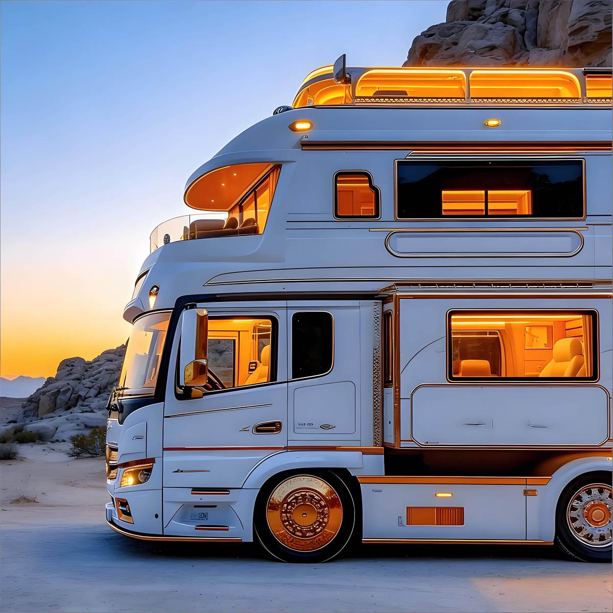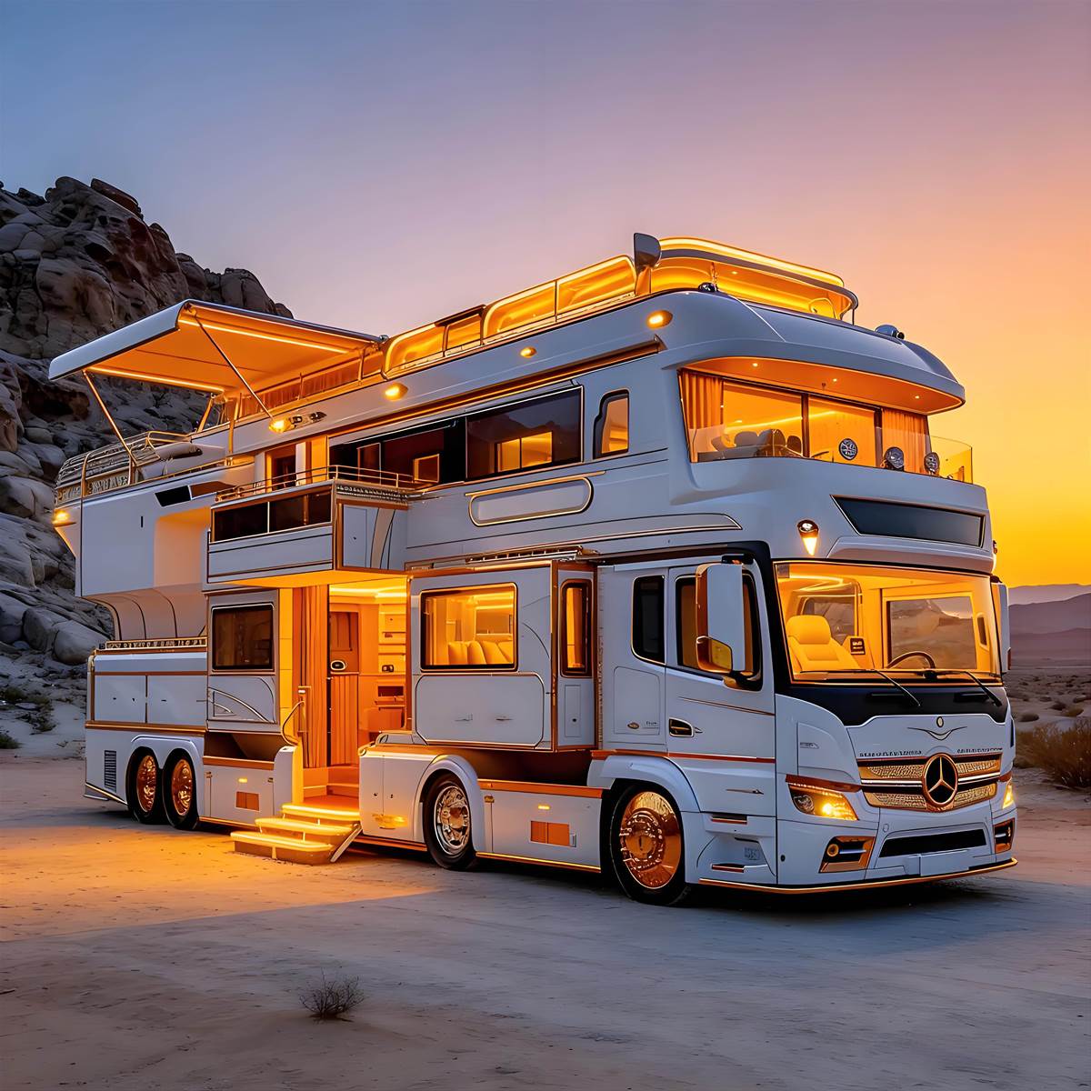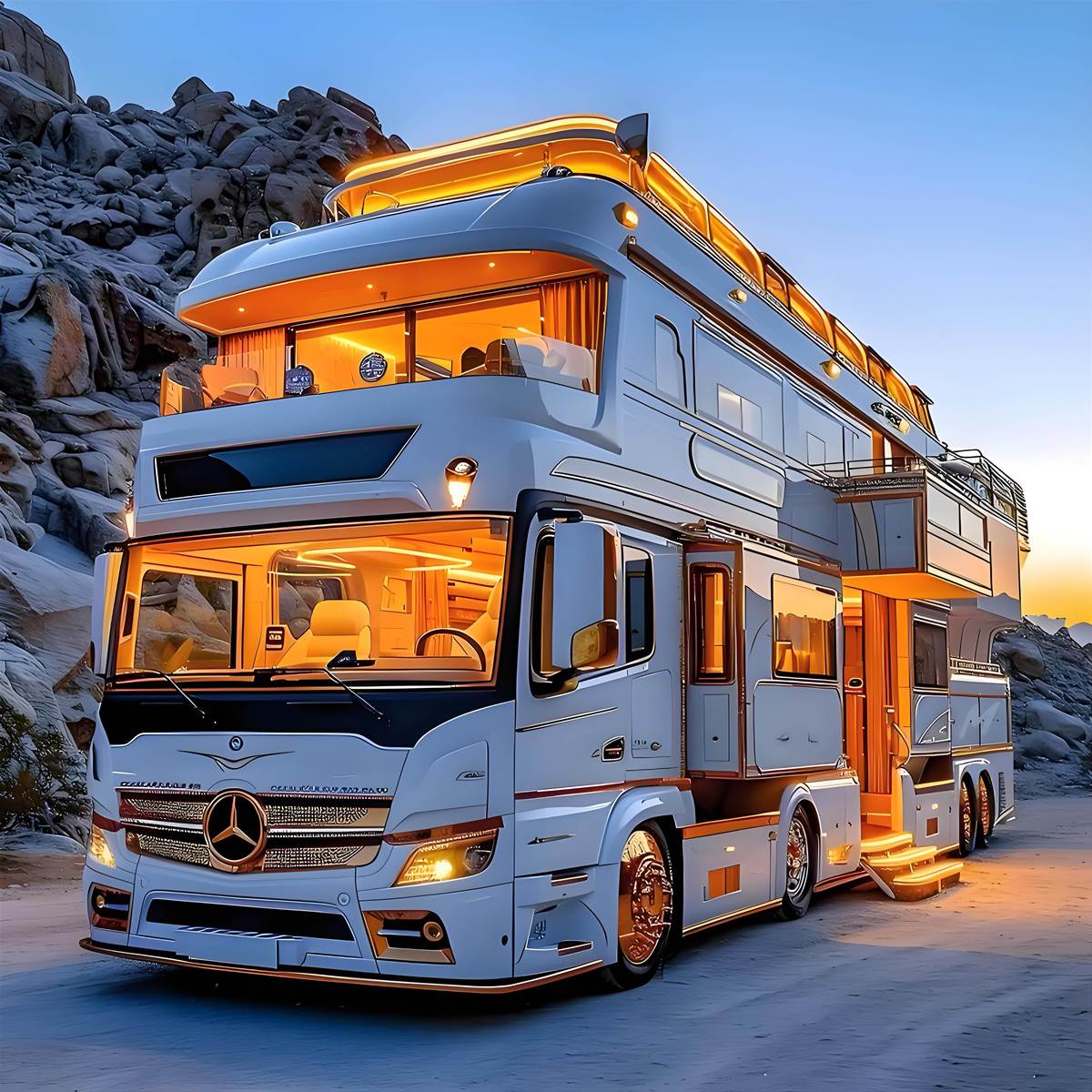這臺賓士 Atego 底盤打造的雙層露營車,在市場開價 1288 萬新臺幣。外觀維持三芒星家族化設計,搭配鍍鉻飾條點綴,夜間行駛時車頂氛圍燈宛如移動燈塔。