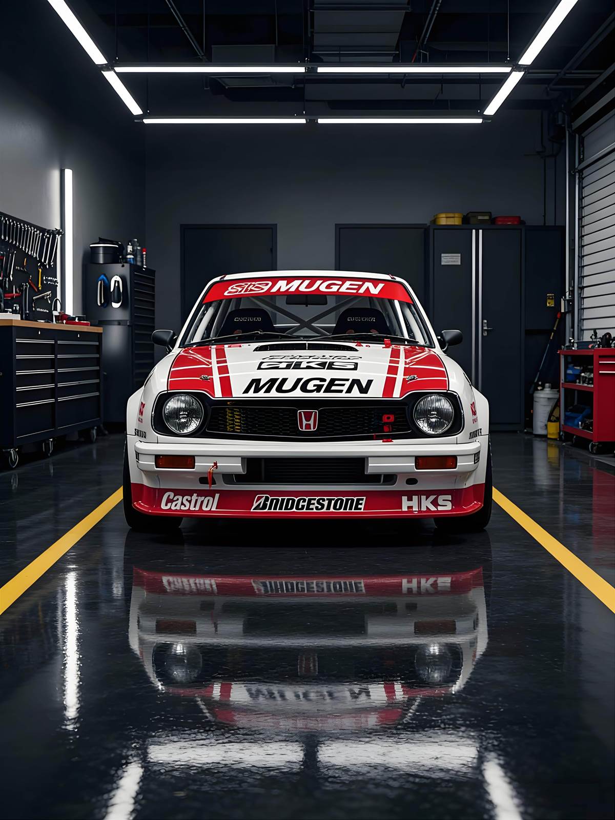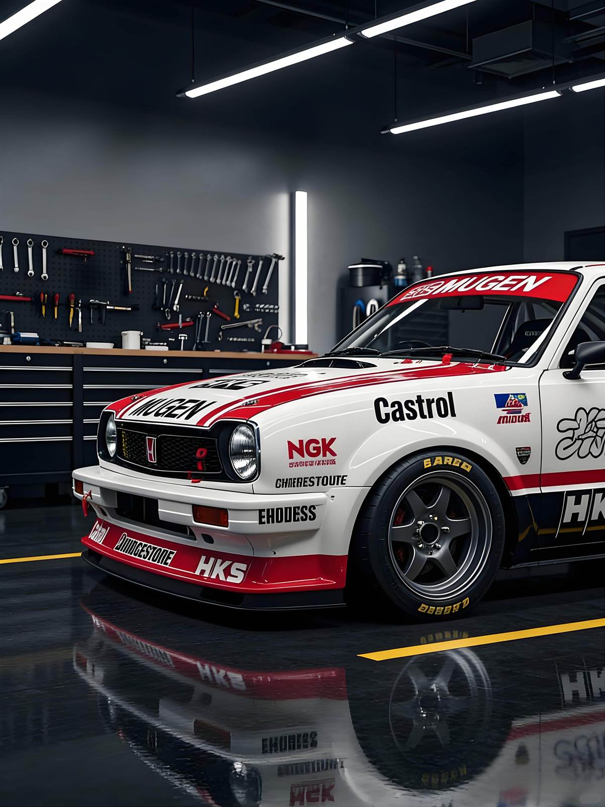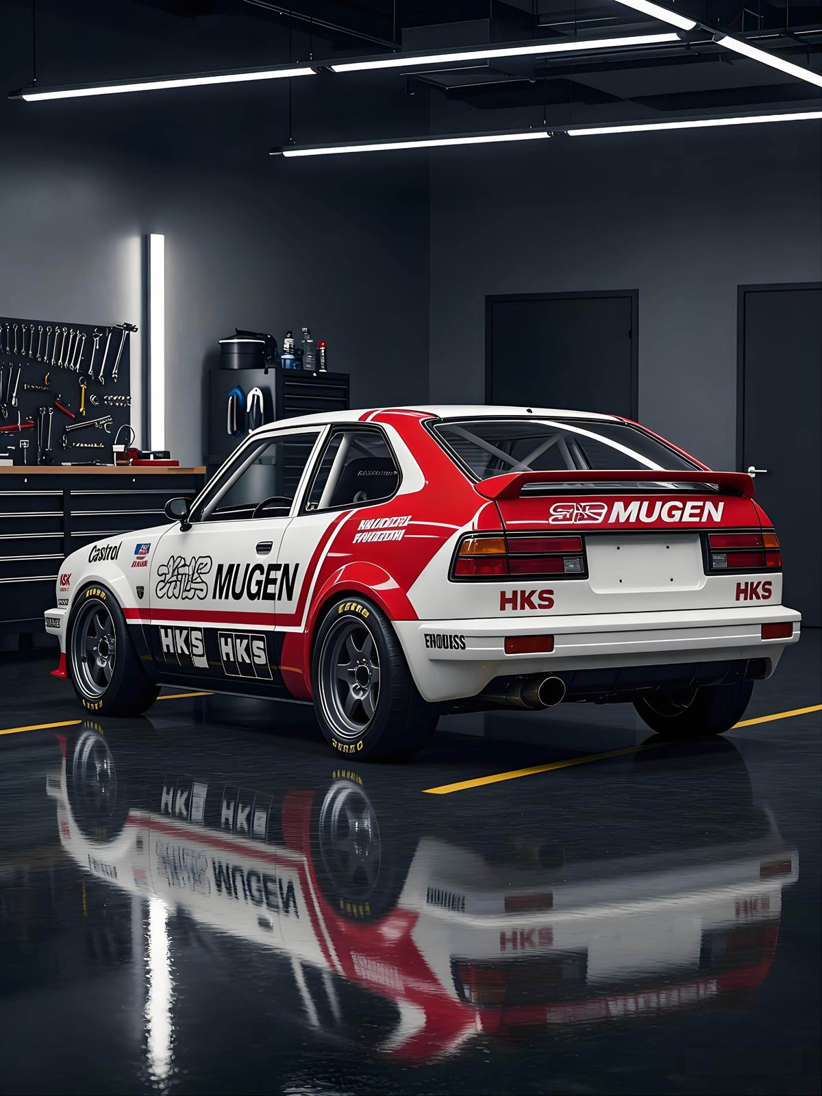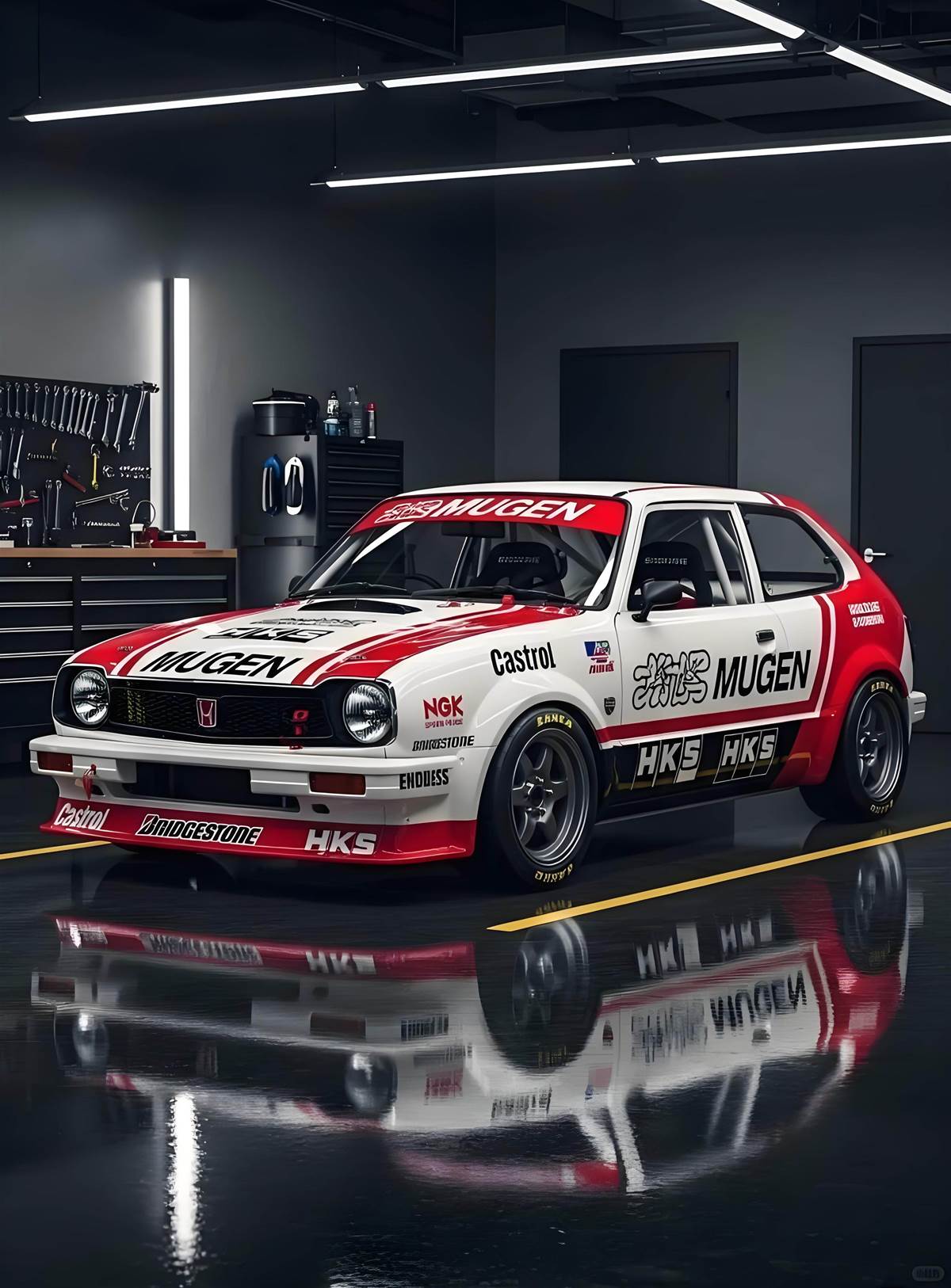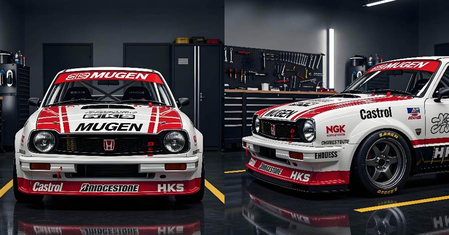 車頭經典本田廠徽搭配 MUGEN 專屬水箱護罩,圓形大燈復刻老車韻味,紅白拉貫穿車身,停在改裝廠內宛如賽道歸來的戰神,視覺衝擊力爆表。車尾搭載 MUGEN 尾翼與雙出排氣管,HKS 字樣點綴側身,流線車身搭配寬體輪拱,既保留本田小車的靈巧,又增添賽車的侵略性,比例完美無瑕。