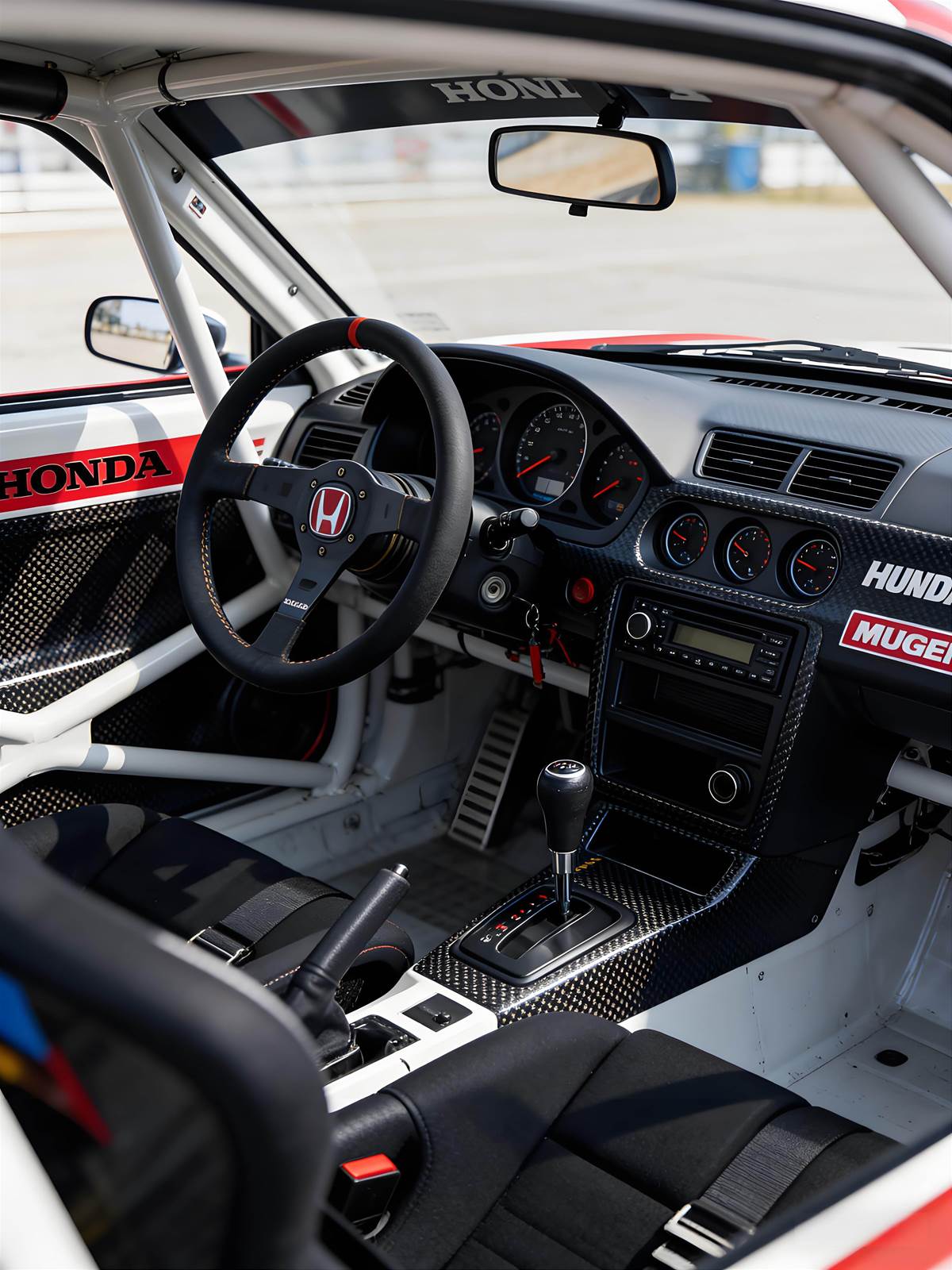 走進車內,防滾籠、MUGEN 賽車方向盤與碳纖維飾板全數上身,賽車座椅搭配快拆方向盤,儀表臺與中控區充滿戰鬥氣息,坐進去就想踩油門奔馳。內裝以黑紅為主調,碳纖維飾板覆蓋中控臺,手排檔把與賽車踏板強化操控感,全方位防滾籠保障安全,將街車與賽車的精髓完美融合。