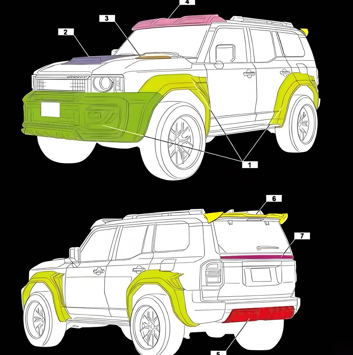 寬體套件:霸氣感直接拉滿核心亮點當屬 MUDRON 專為 LC250 打造的 GT-X 寬體套件。這套套件包含前擾流、加寬輪眉、側裙與后下護板,相比原廠更具肌肉線條,完美呼應 「水泥叢林探險家」 的定位。參考日本原廠定價換算,整套寬體套件約新台幣 38.5 萬元,雖屬高端定制,但細節做工與貼合度堪稱同級標桿。