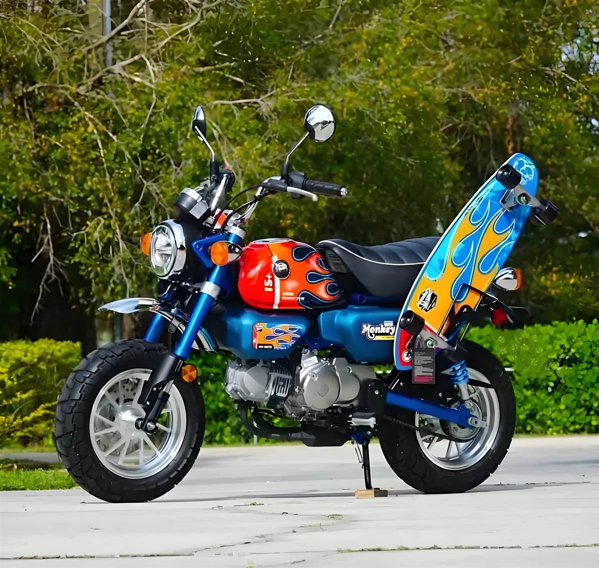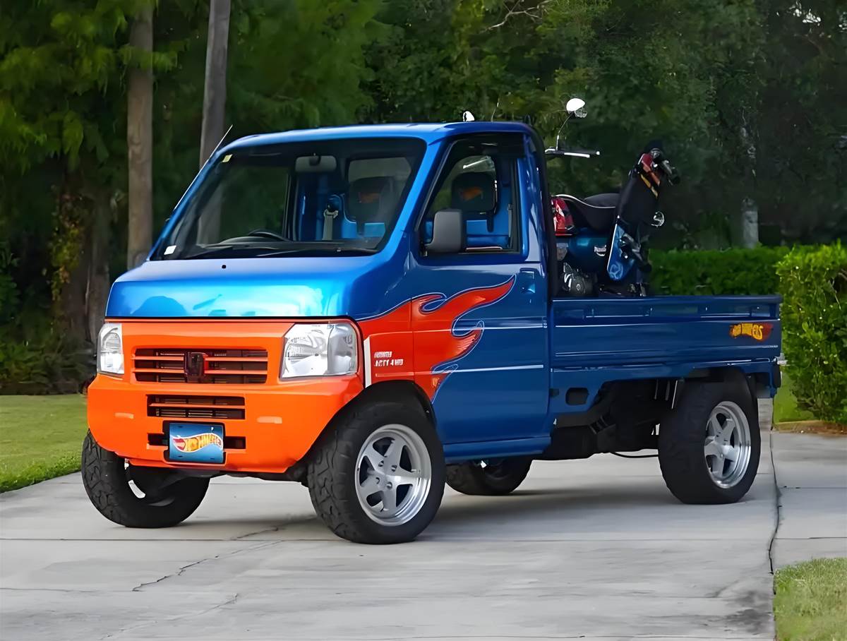 ACTY 小貨車以藍色為基底,車身兩側飾有紅橙色火焰紋飾,視覺張力十足。駕駛艙內部採用藍、橙雙色搭配,頭枕上更繡有經典 Hot Wheels 標誌,細節滿分。至于後部貨廂,則載放著同風格改裝的 Monkey 輕型機車,同樣以藍色為底,油箱兩側點綴火焰紋路,整組搭配風格統一,復古又吸睛。