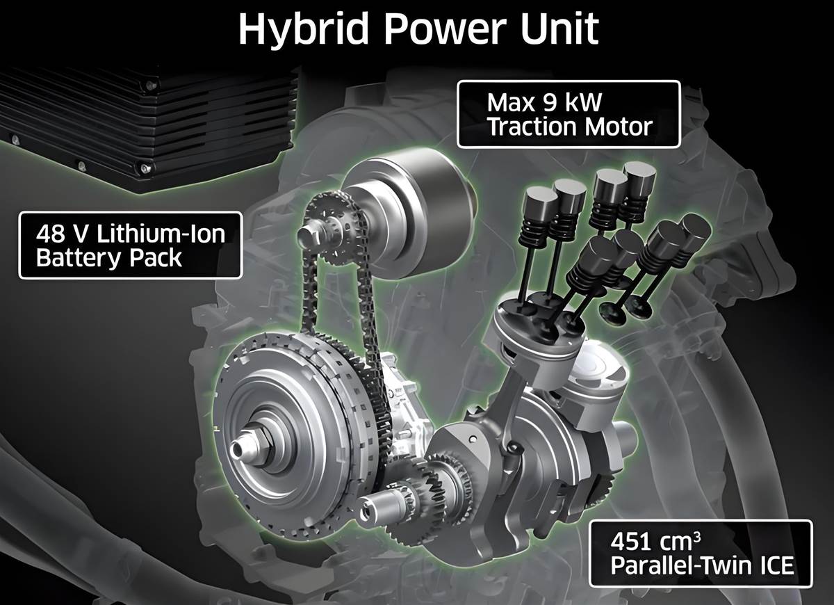 這款車的動力單元相當特別,在 451cc 雙缸引擎配備的水冷散熱器上方,巧妙佈置了 48V 鋰電池組。搭配 6 速手自一體變速箱與 9kW 功率的牽引馬達,不僅維持了原有的動力輸出,更帶來了電動馬達的輔助動力,讓整體動力表現相當于 600cc 至 750cc 排氣量的傳統燃油車,兼具效率與效能。