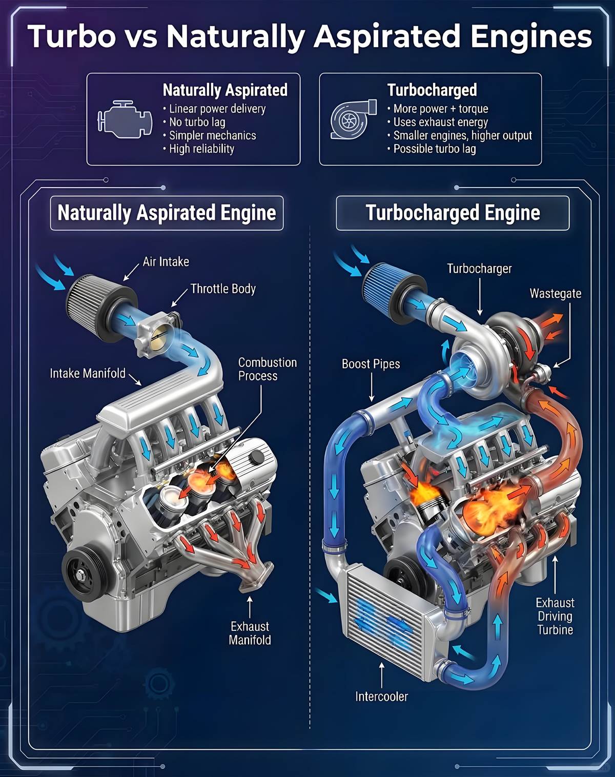 通常情況下,自然吸氣發動機相對更省油。 首先,從工作原理來看,自然吸氣發動機透過活塞下行產生的負壓,將空氣吸入氣缸,其結構較為簡單。相比之下,渦輪增壓發動機利用渦輪增壓器壓縮空氣進入氣缸,增加進氣量,從而提高動力輸出。
