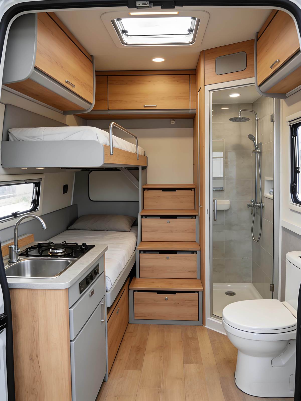 露營空間:後方起居區配備折疊床鋪、簡易廚房與儲物空間,雖不算奢華,但足以滿足 2-3 人的短途露營需求。
