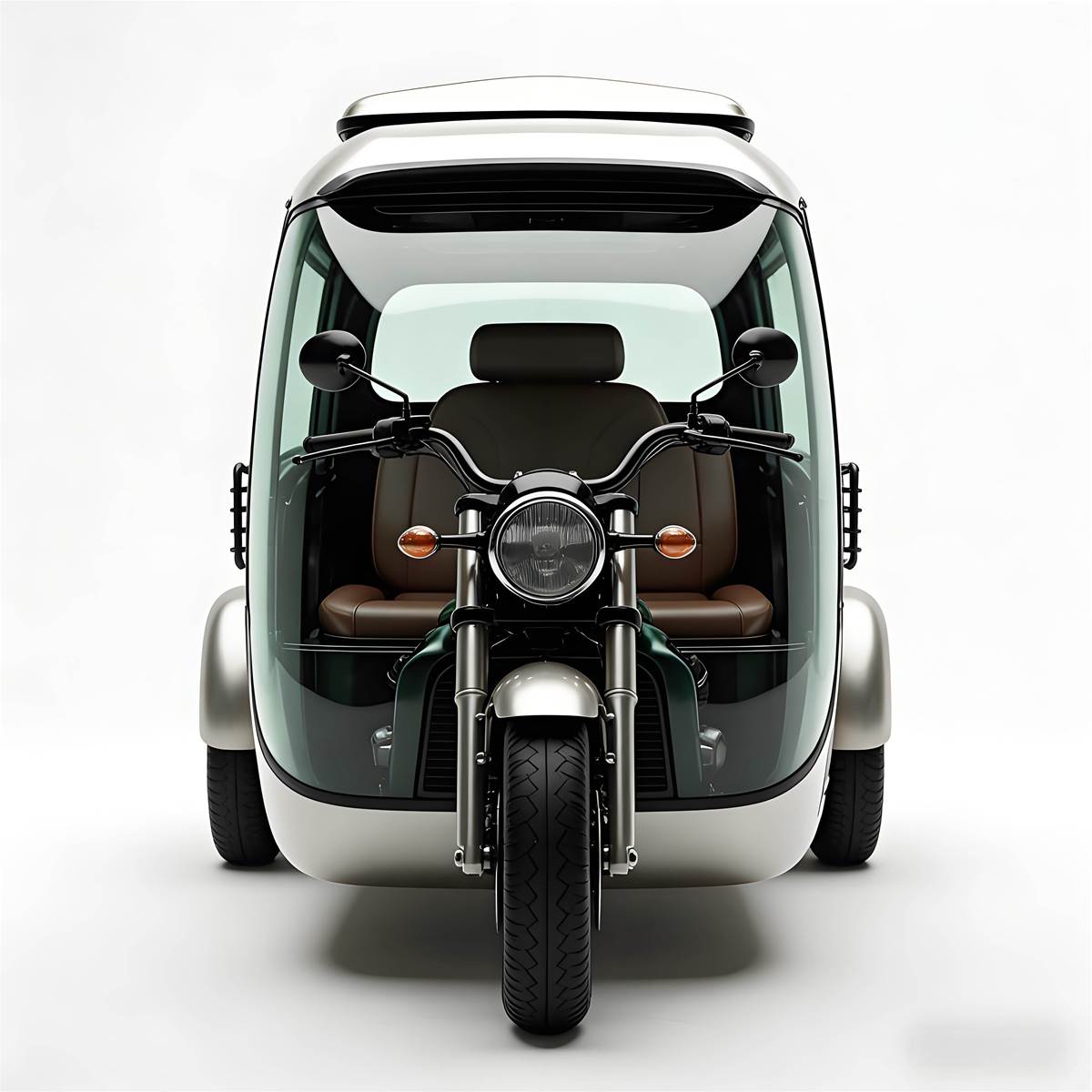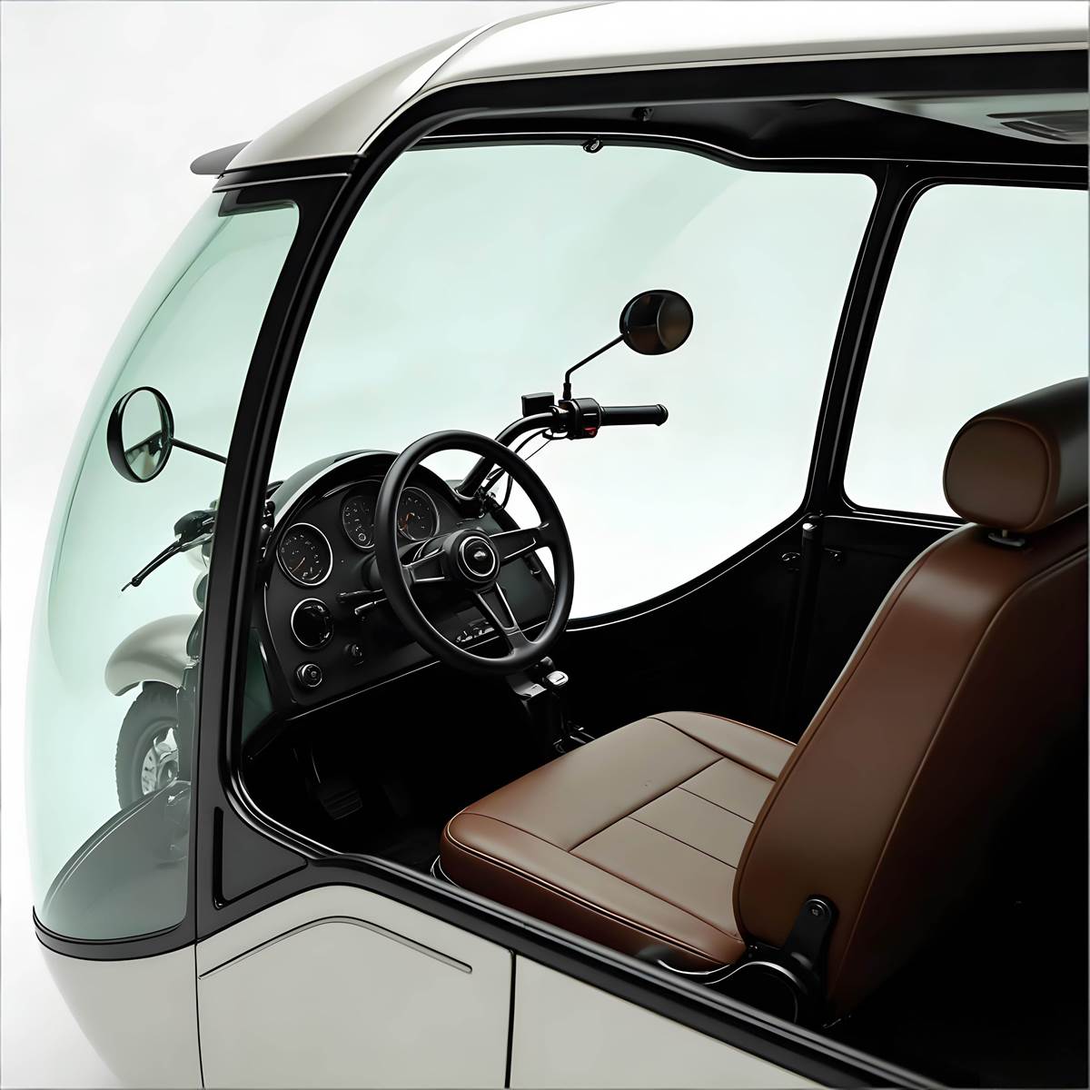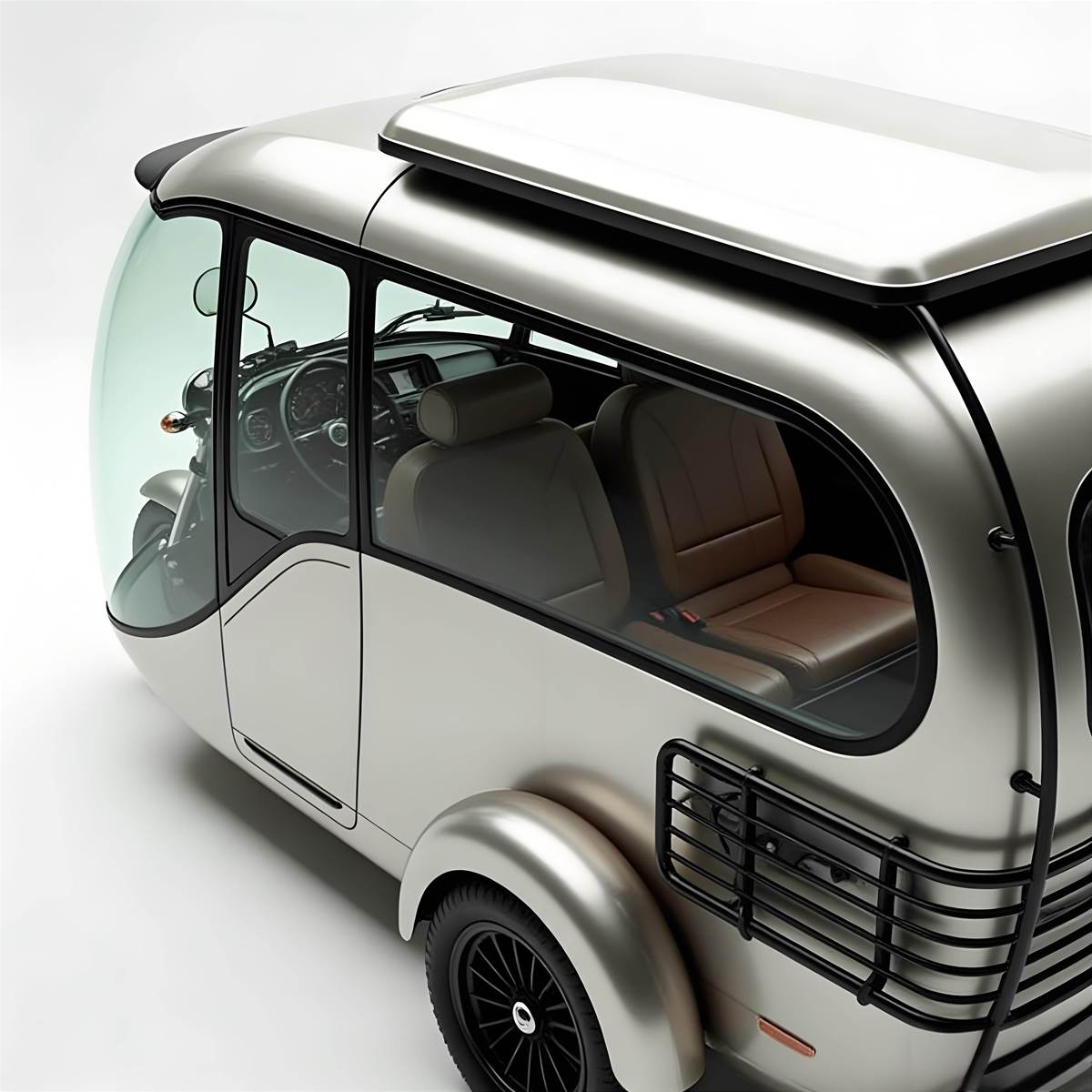 半透明車體,全景視野體驗拉滿檔這款半透明三輪車的外觀設計可謂是「都會移動的透明藝術品」!車身採用高透性半透明材質搭配質感銀色車身,前擋與側邊的超大透明視窗幾乎覆蓋整個車身,不僅讓駕駛者擁有360°無死角的超寬闊視野,行駛時還能盡情欣賞街景,打破傳統車輛的視野侷限。