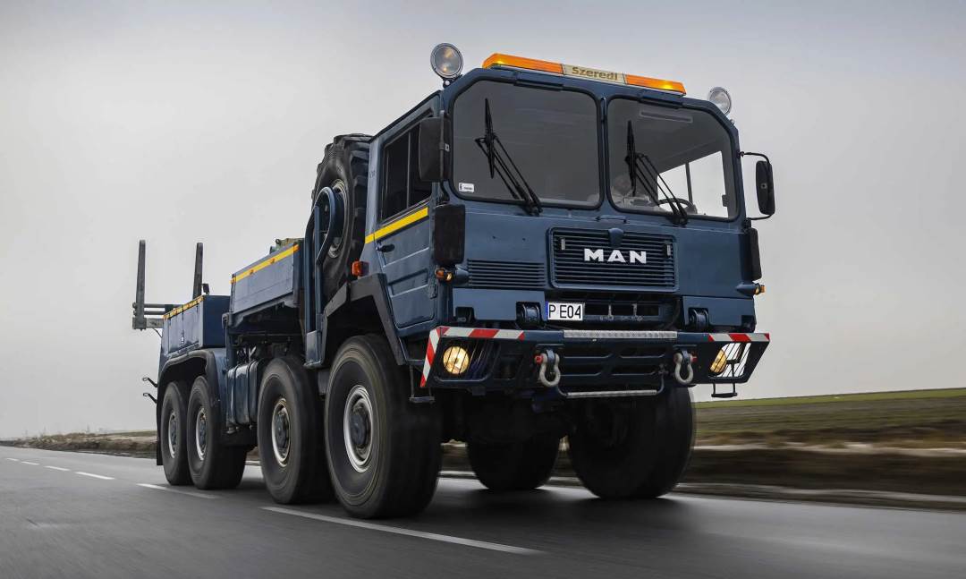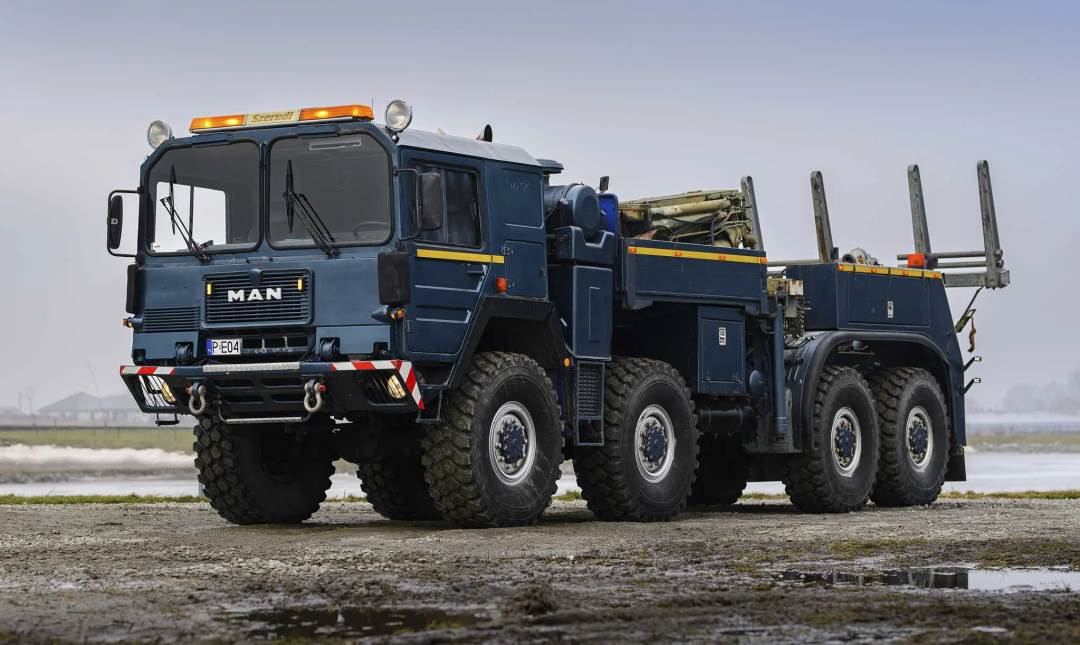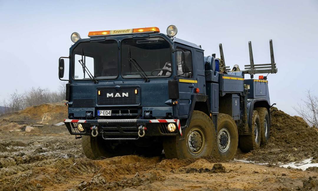 這款拖吊救援車改裝自退役軍規 MAN KAT2 重卡,採 8×8 全驅設定,搭載 MAN D2840 雙渦輪 V10 水冷柴油引擎,搭配 ZF 八速手排變速箱、WSK 400 液力扭力轉換器與雙速加力箱,過載起步與脫困表現相當強悍。