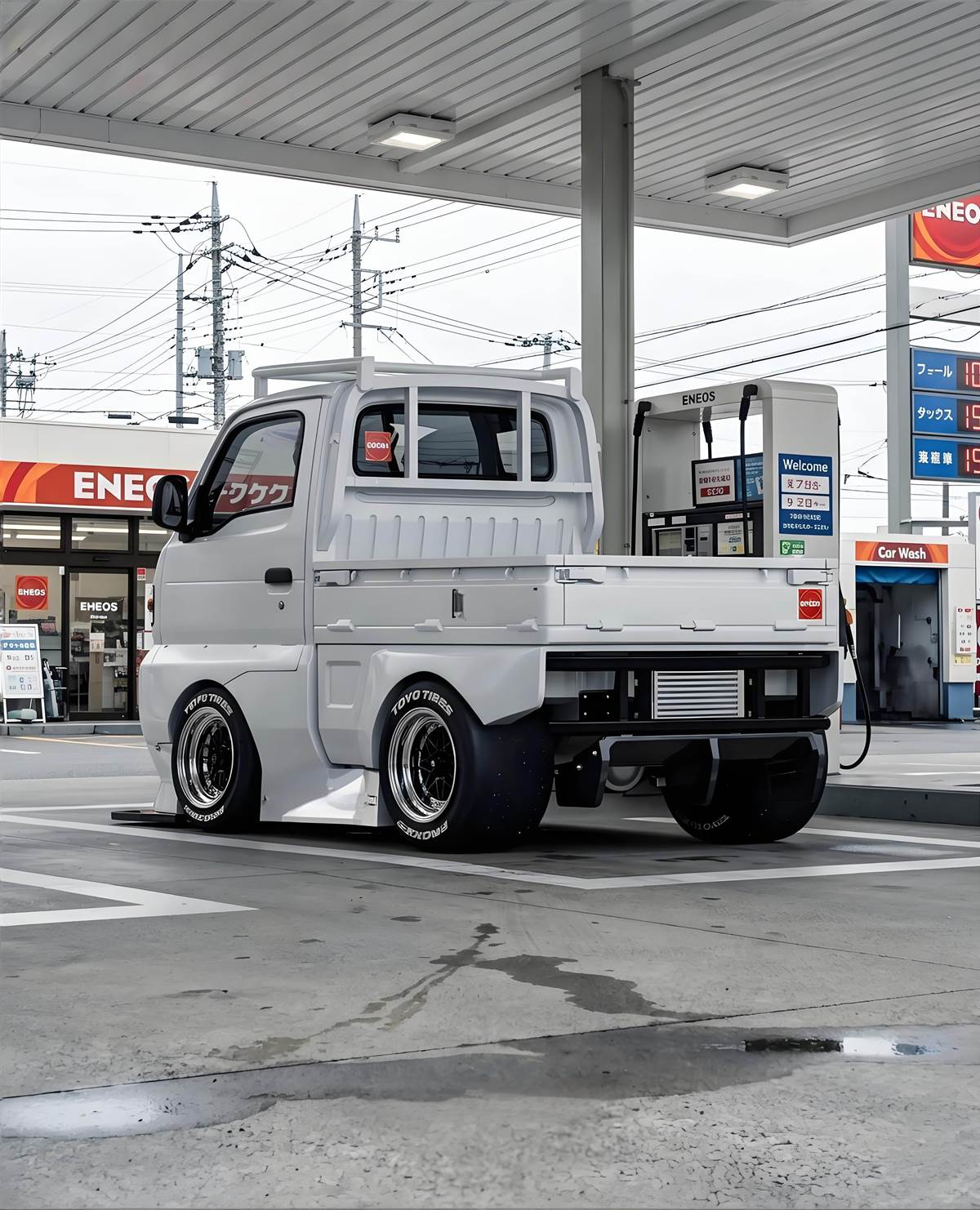 這臺改裝車選用了經典的白色寬體套件,搭配 Hoonigan 與 Worthouse 的潮流塗裝,不僅降低車身強化貼地感,更換上 TOYO 漂移胎與鍛造輪圈,把原本偏向載貨的底盤,調校成適合激烈操駕的漂移設定。