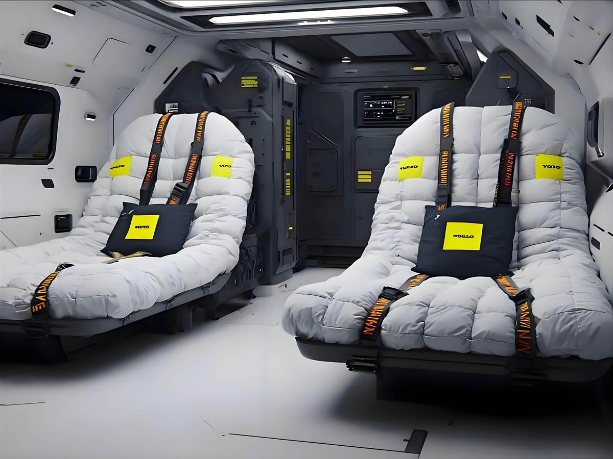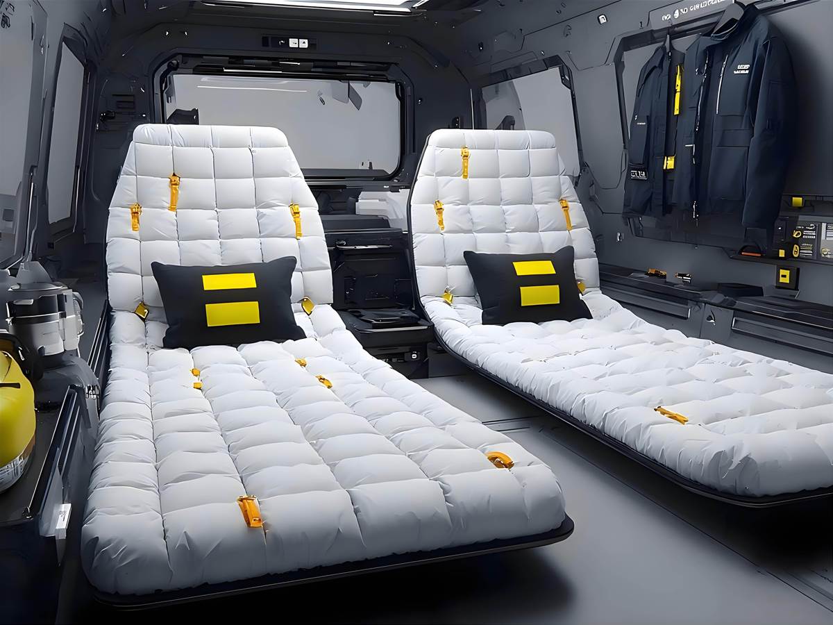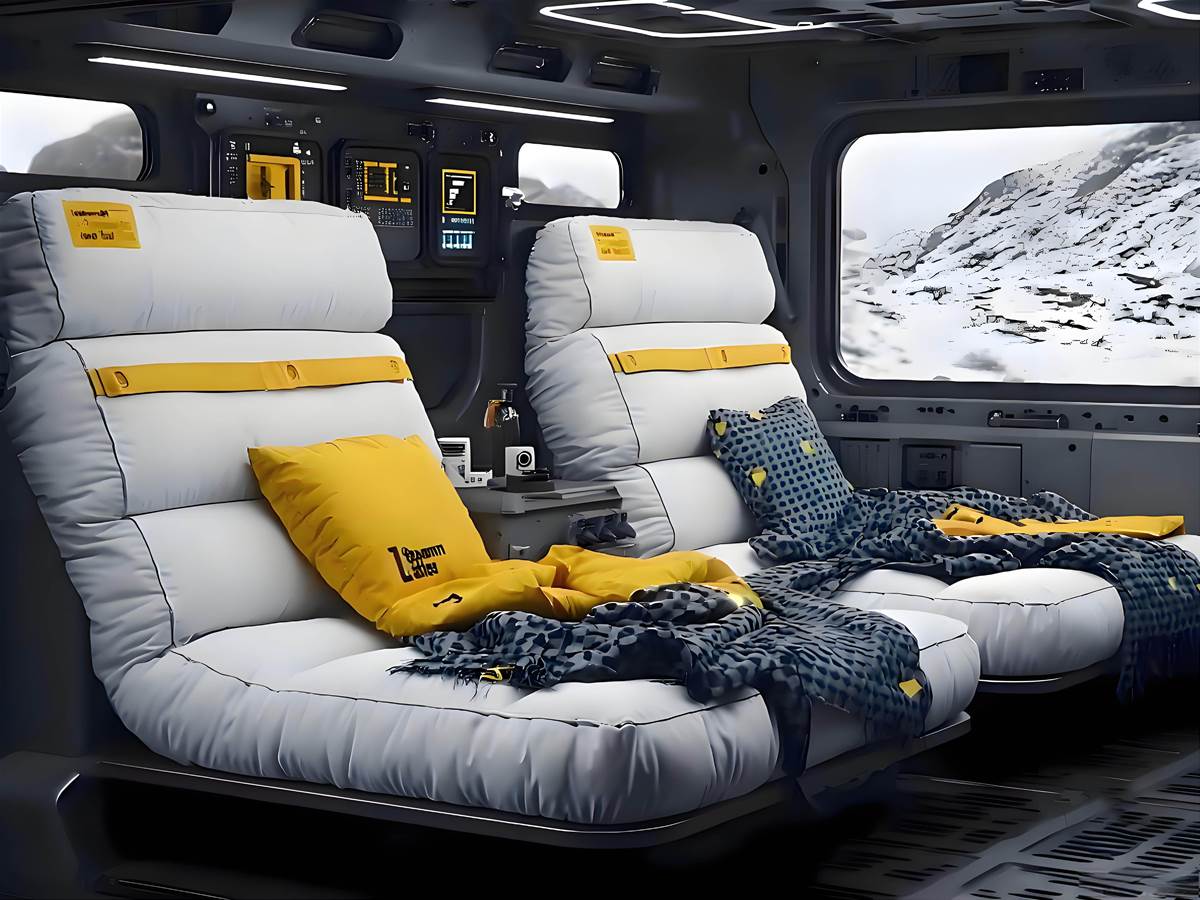 內裝部分稱得上「移動野奢臥艙」:雙人懸浮座椅以柔軟填充物包覆,黃色飾條點綴提升質感,大面積車窗讓行駛中也能飽覽山景,相當于把露營基地縮排四輪裡。