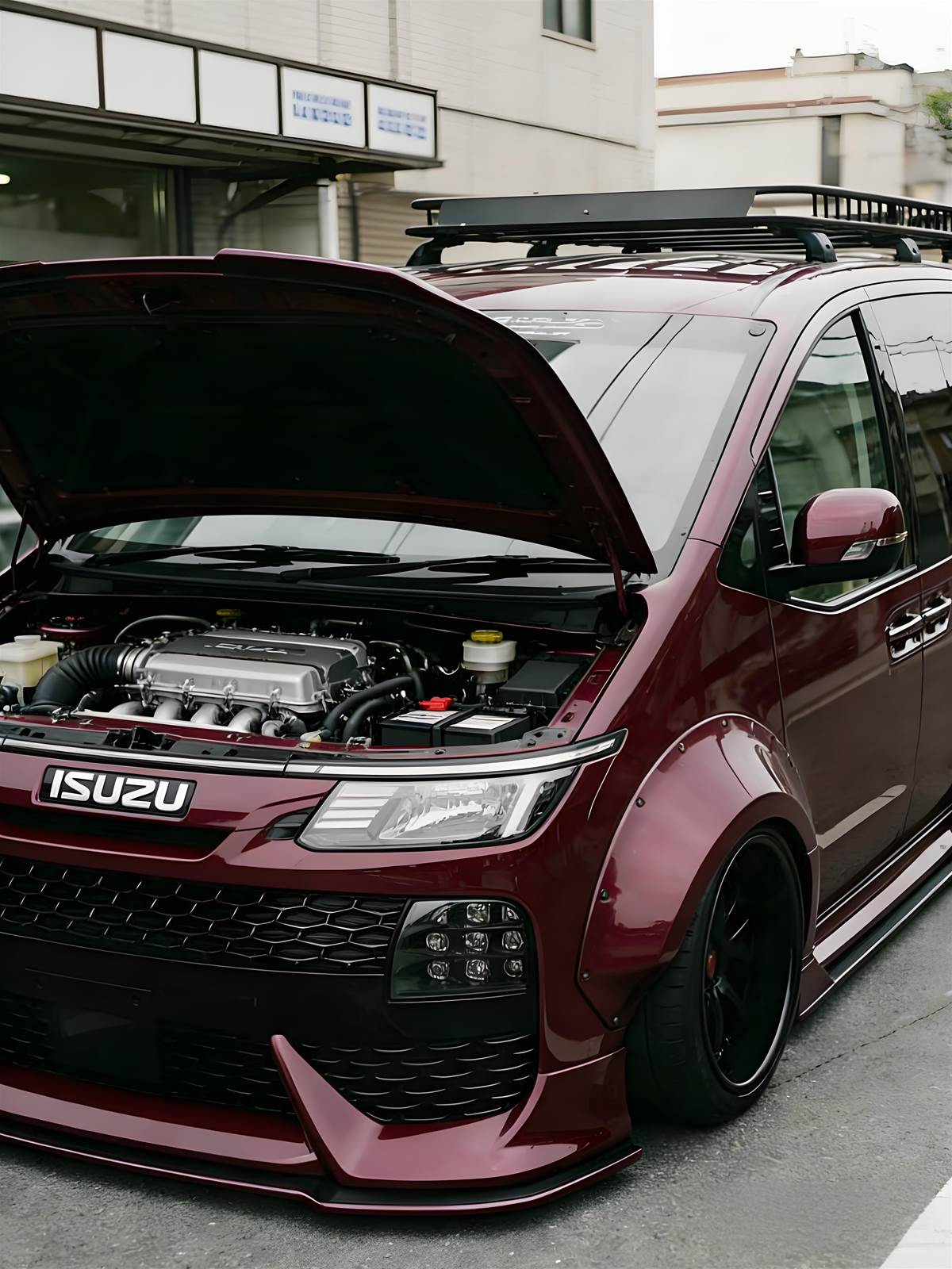 從外觀來看,這臺五十鈴MPV全車換裝酒紅色金屬漆,在陰雨的街頭依舊閃耀著高階質感,比起原廠銀色更具攻擊性。車身加裝了寬體套件,輪眉外擴的線條讓整車寬度瞬間拉滿,搭配低趴的絞牙避震,輪胎幾乎貼合地面,經典的「hella flush」風格彰顯無遺。