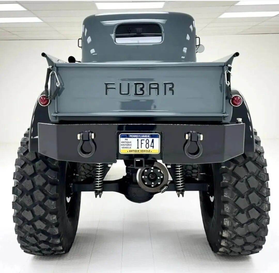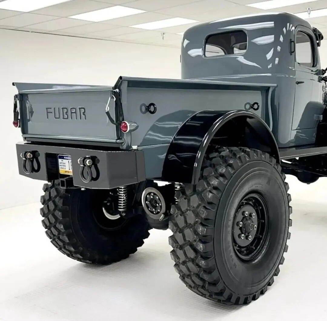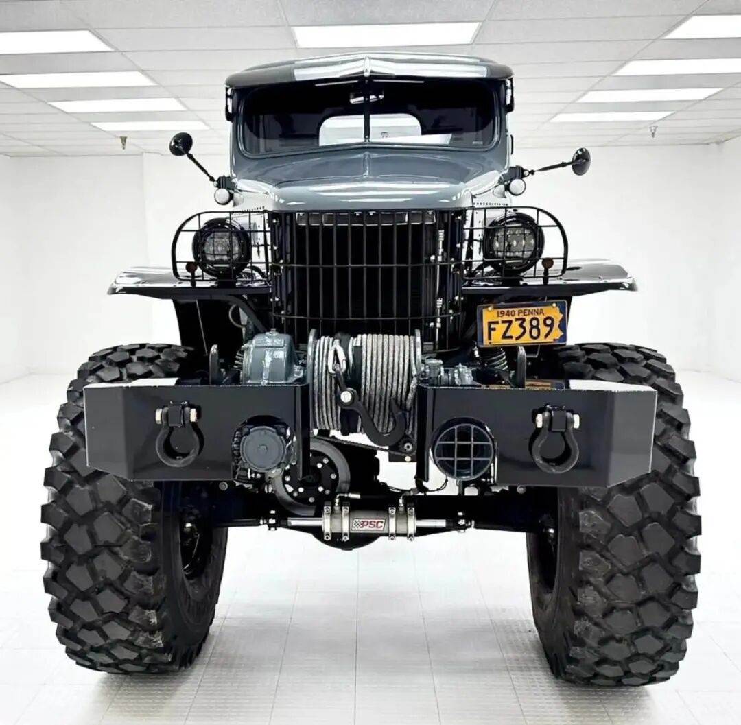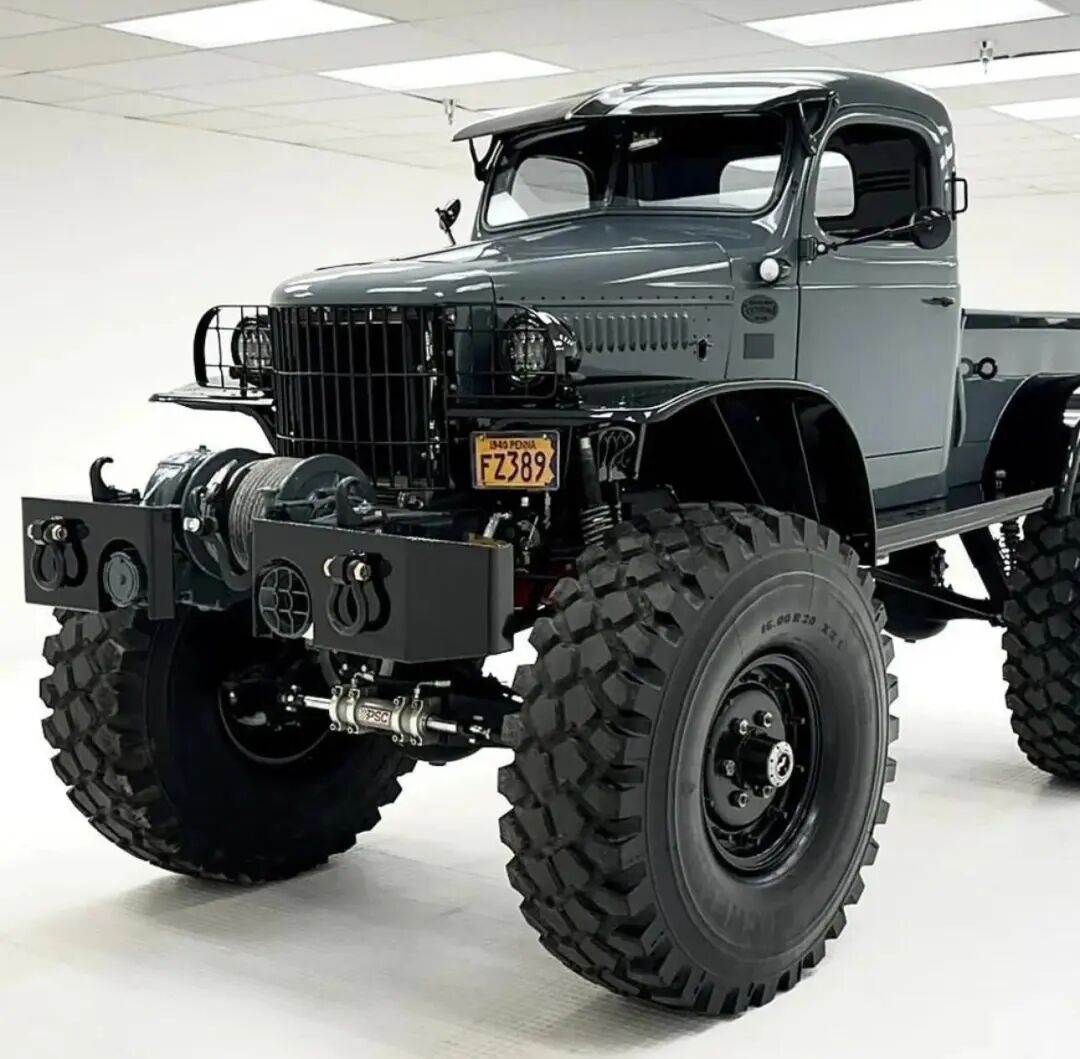 第一眼見到這輛深灰色道奇,彷彿闖進老電影裡的硬漢場景 ——1940 年的「PENNA FZ389」車牌滿是歲月痕跡,黑色大面積水箱護罩搭配圓形大燈,金屬防護框包覆燈組,宛如給雙眼戴上「防撞盔甲」;寬闊前保桿、拖車鉤、粗壯絞盤搭配深邃胎紋,每處細節都在宣告「我天生就是能扛事的硬底子」。