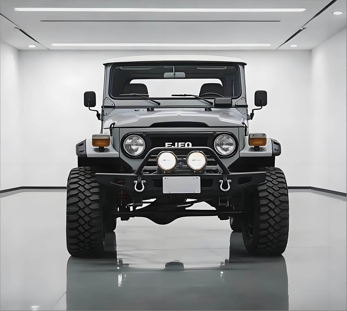 外觀完整復刻 FJ40 經典輪廓,方正車頭搭配圓燈設計,鋼製車鬥與高離地間隙兼具實用性與硬派風格,前保險桿輔助燈與全地形輪胎,讓它在林道與郊區路段都能暢行無阻。
