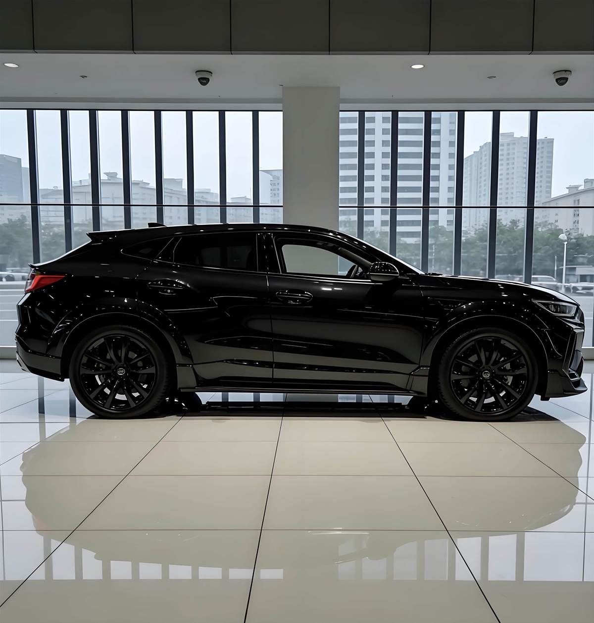 車身側面:流暢的溜背式轎跑線條,搭配黑色懸浮車頂、運動側裙、大尺寸燻黑多輻輪轂,線條動感凌厲,徹底擺脫了傳統 SUV 的笨重感,運動感爆棚。 尾部設計:貫穿式紅色尾燈 + 大尺寸擾流尾翼,運動化後槓搭配單邊共兩出排氣,既強化了效能屬性,又提升了視覺層次感,黑武士細節前後呼應,帥到犯規。