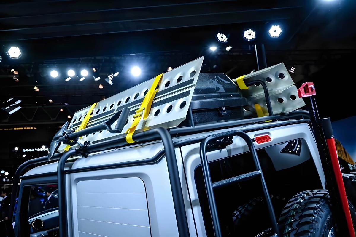 車尾配備帶高位剎車燈的外接備胎架,並加裝紅色爬猴桿,這可是專業越野必備的脫困工具,應對陷車等突發狀況更從容。車頂則搭載行李架與探照燈組,不僅拓展戶外裝載空間,也強化夜間探險的照明能力,完美契合戶外探險的核心需求。