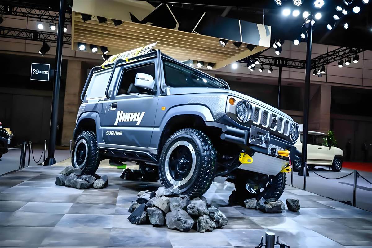 這臺「SURVIVE生存」主題吉姆尼,是以0.66L輕自排版本為原型車改裝而成,風格偏向硬核越野。車身以啞光灰為主色調,視覺上充滿冰冷的力量感,底盤整體升高3英吋(約12cm)。外觀升級大花紋全地形越野輪胎與加寬防脫鋁圈,大幅提升復雜路況的抓地力與通過性,車頭更加裝競技前保桿與不鏽鋼護板,防護力拉滿。