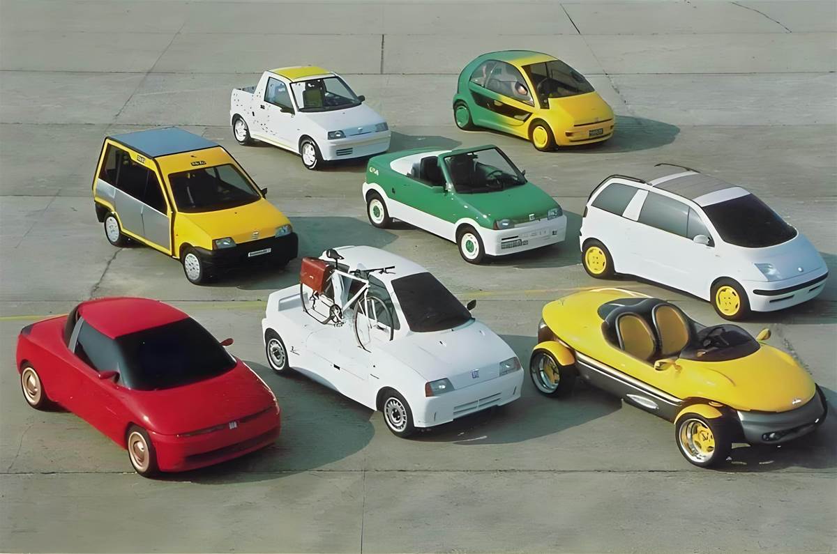 1992 年的杜林車展上,飛雅特集結了多款由不同設計團隊打造的概念車,均以品牌現行量產車款為基礎進行二次創作。其中右側那部白色的 Fiat Cinquecento ID-Lucciola「螢火蟲」格外關鍵,它正是奇瑞 QQ3 與雪佛蘭斯帕可/大宇馬蒂茲的設計原型;而展區正中最吸睛的,無疑是 Zagato 設計工作室打造的「車車合一」作品 —— 飛雅特 Cinquecento Z-Eco。
