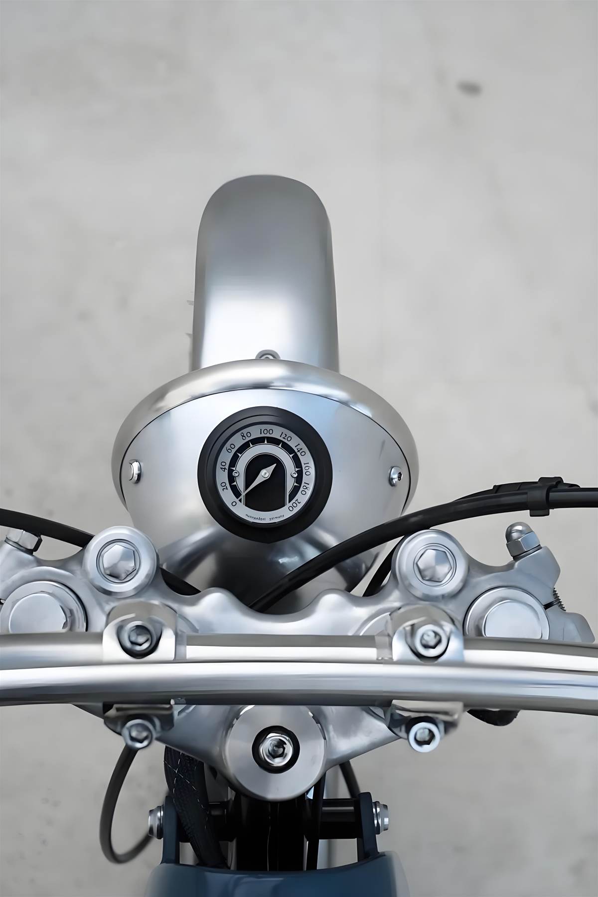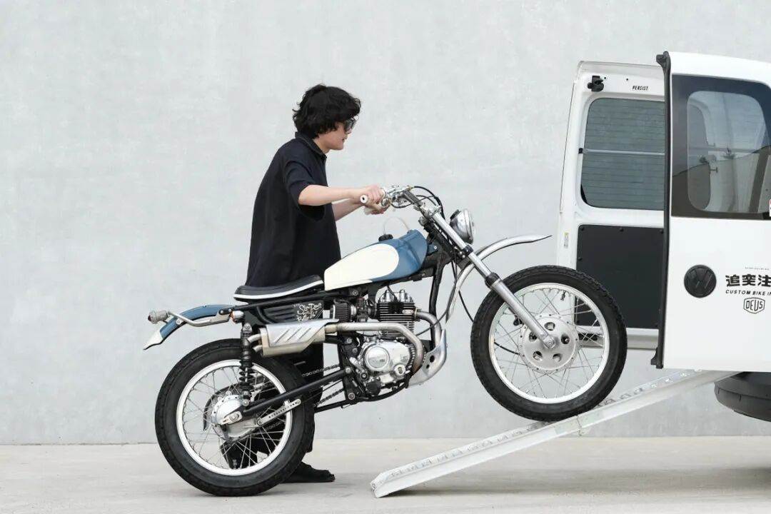 細節質感升級:頭燈選用法國 BAAK 復古圓燈,整合速度錶功能,簡潔又實用;車把改裝美國 Bitwell inc 立管 + 法國 BAAK 高把,騎乘姿勢更挺拔,應對輕度越野更從容。高置鋁合金擋泥板與側蓋均為客製化打造,線條利落不多餘。
