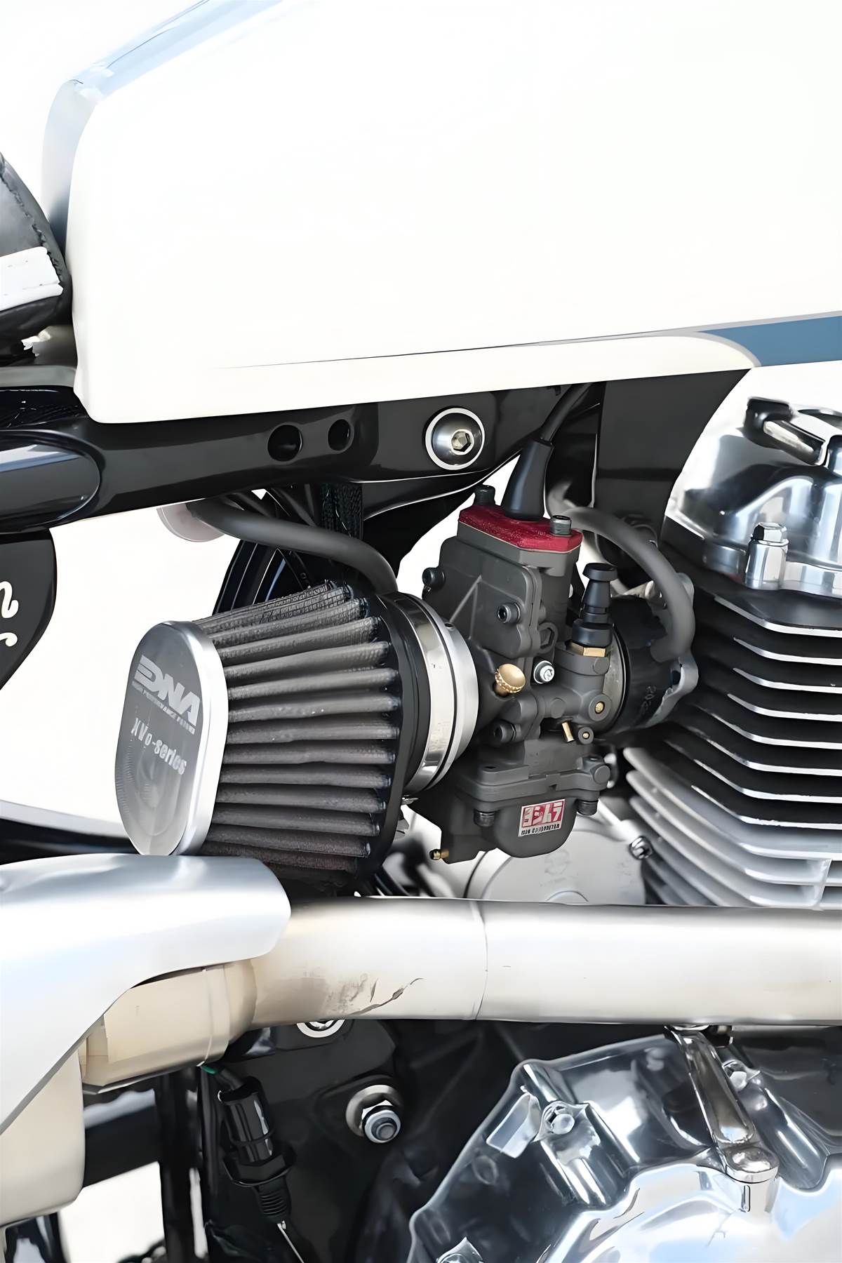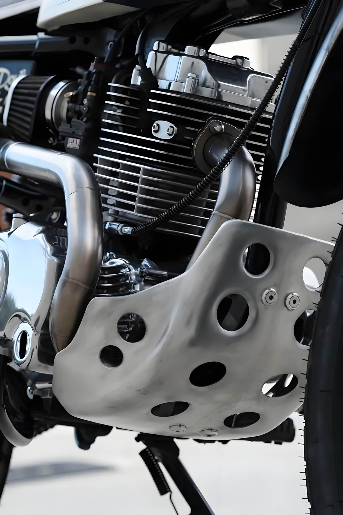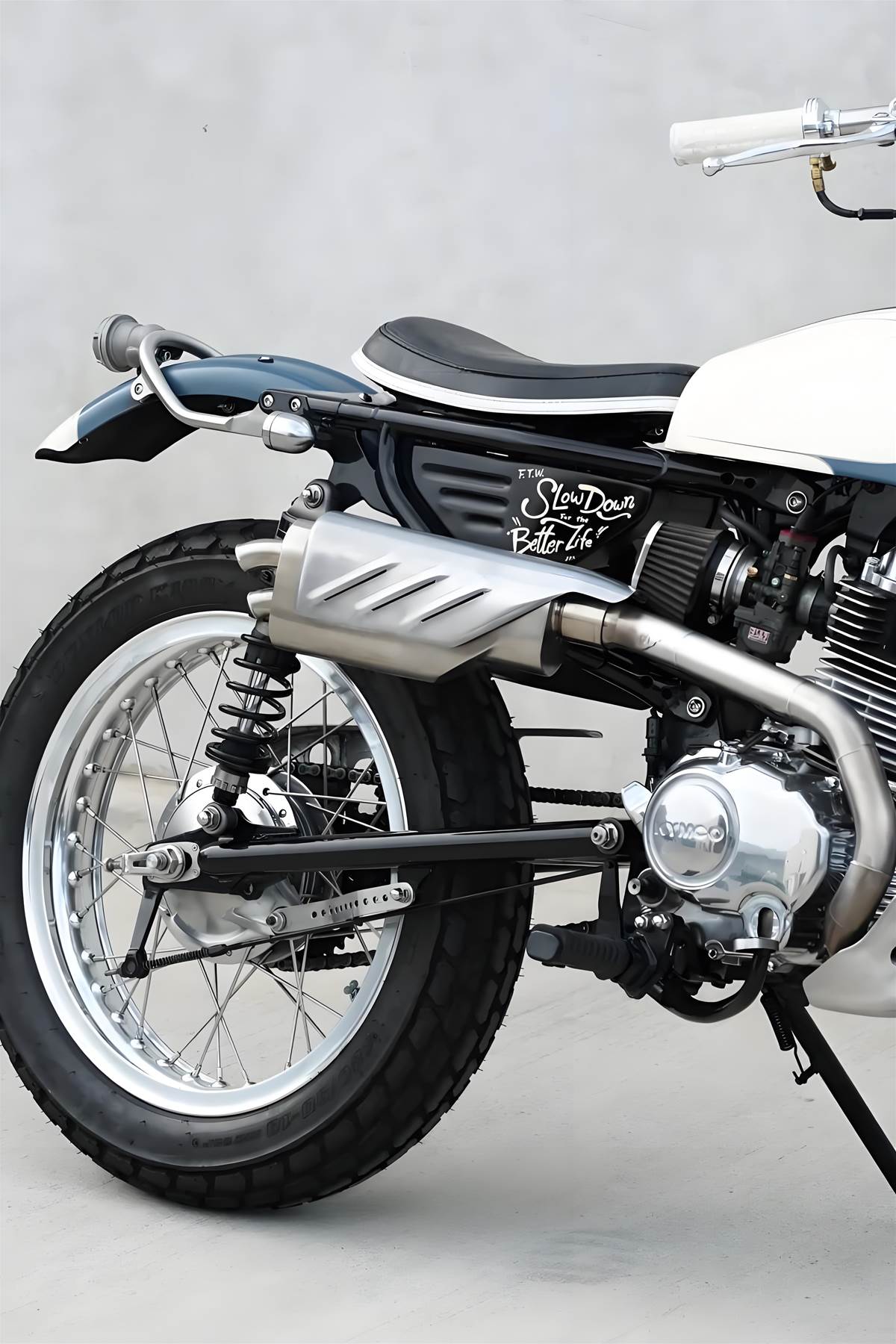 改裝核心:外觀復古 × 實用兼備 經典輪廓重塑:捨棄原廠線條,換上狹窄流線的 Suzuki RG 50E 復古油箱,搭配手工打造的單人長椅坐墊,營造濃厚復古越野氛圍。前後分別採用 21 吋、18 吋輻條輪圈,搭配 Shinko 越野胎,既符合 Scrambler 風格,又強化非鋪裝路面通過性。